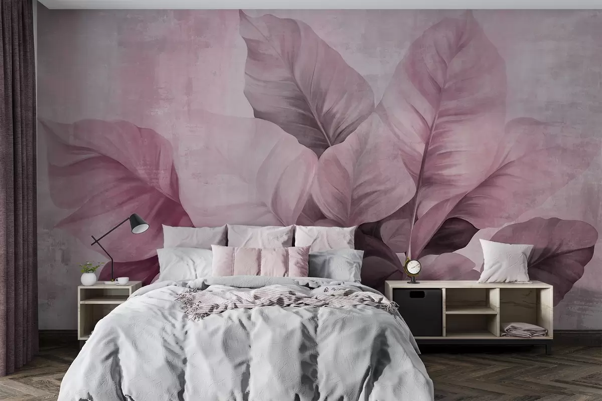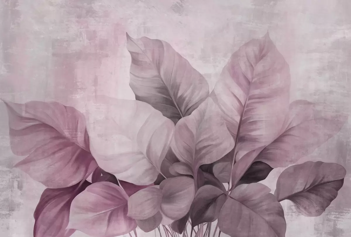 Carta da parati Imitazione pittorica materica di grandi foglie rosa chiaro su sfondo neutro con pennellate delicate nr. w09614v1