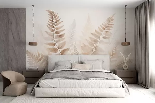 Carta da parati Foglie di felce essiccate e testurizzate in varie tonalità di marrone, con uno sfondo morbido e chiaro in stile acquerello. nr. w09615