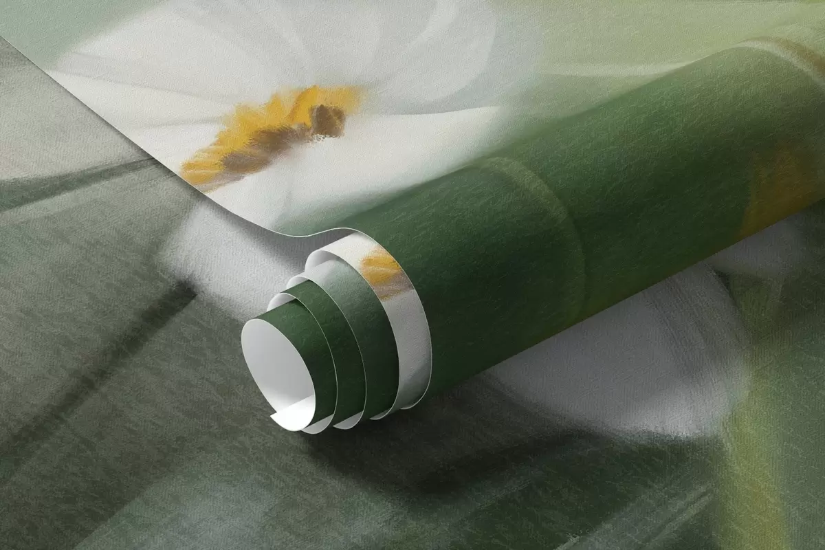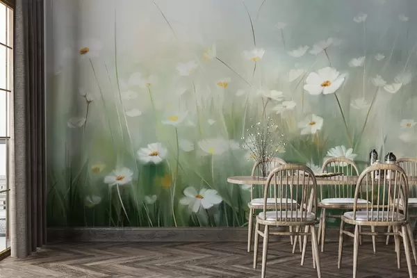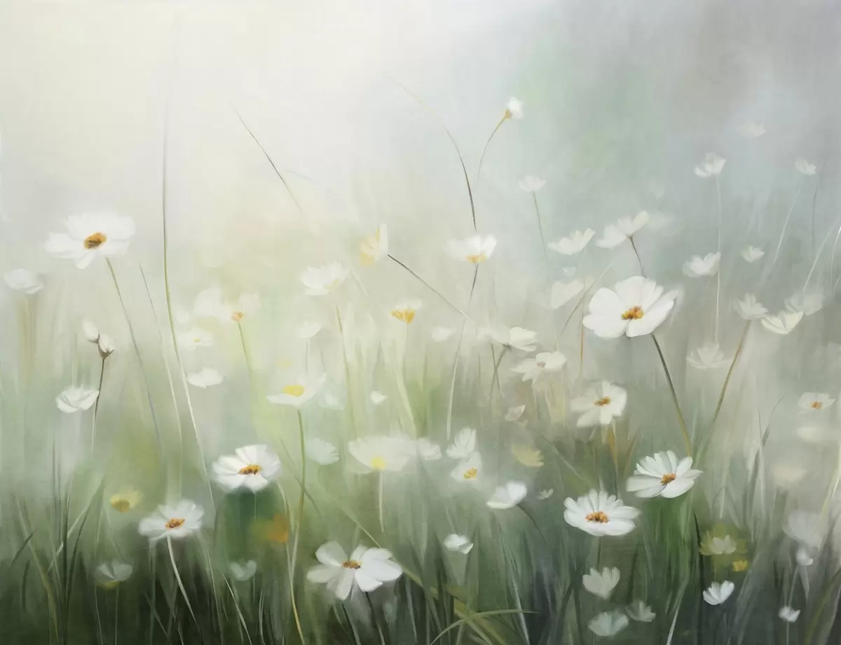 Carta da parati Campo astratto di margherite bianche con erba verde e sfondo sfumato e morbido in stile pittorico nr. w09619