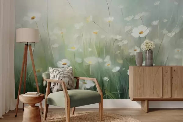Carta da parati Campo astratto di margherite bianche con erba verde e sfondo sfumato e morbido in stile pittorico nr. w09619