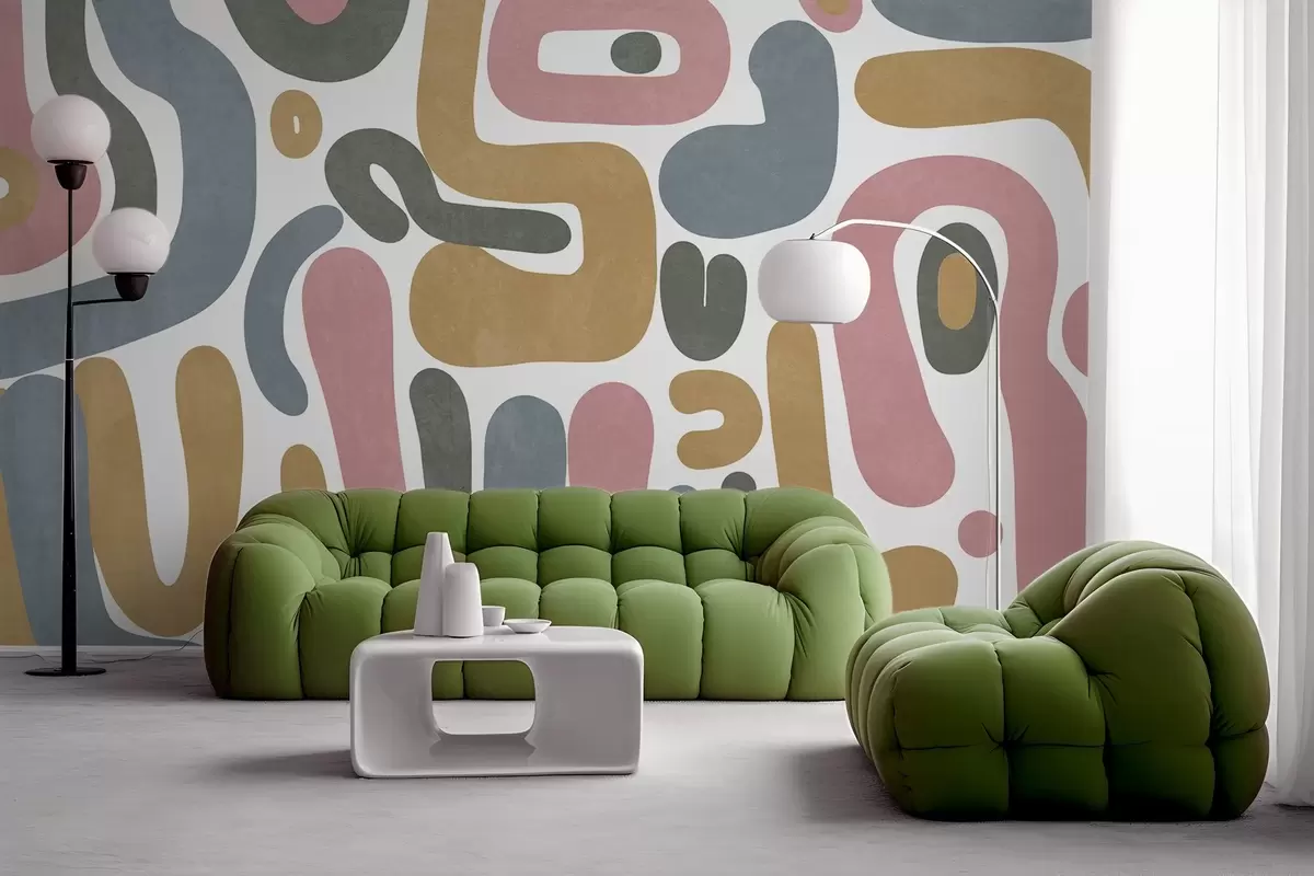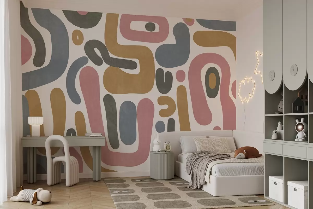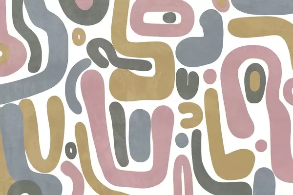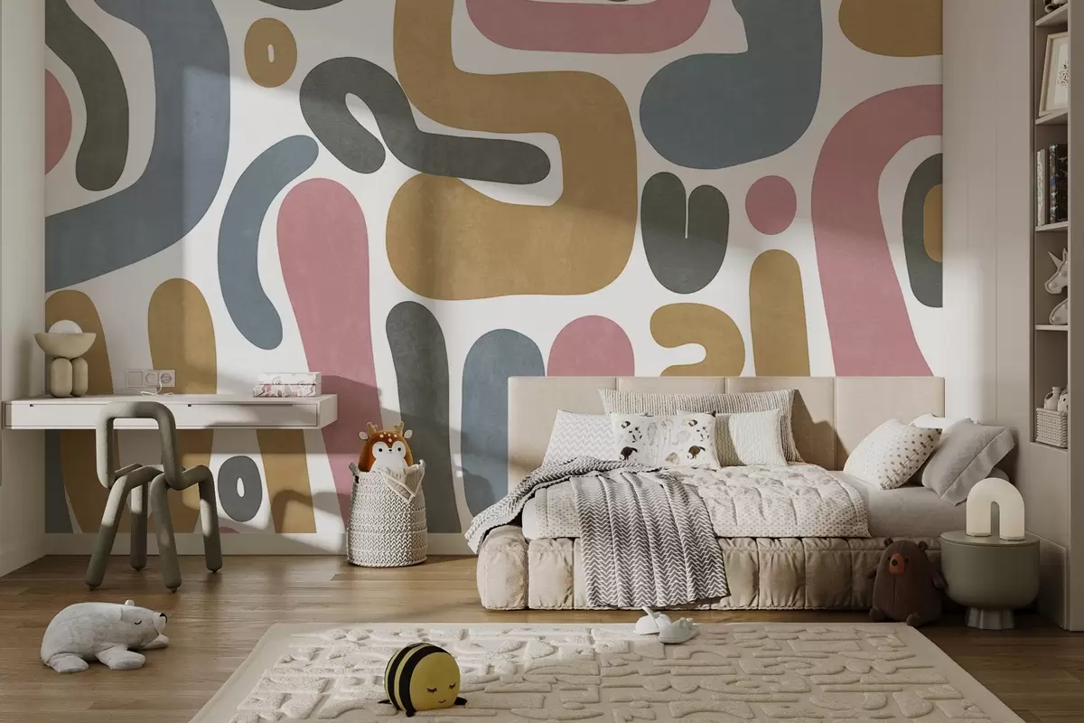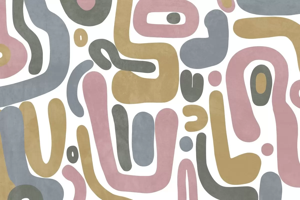 Carta da parati Forme astratte con texture in rosa pastello, blu tenue, giallo senape e grigio su sfondo bianco arte moderna nr. w09620