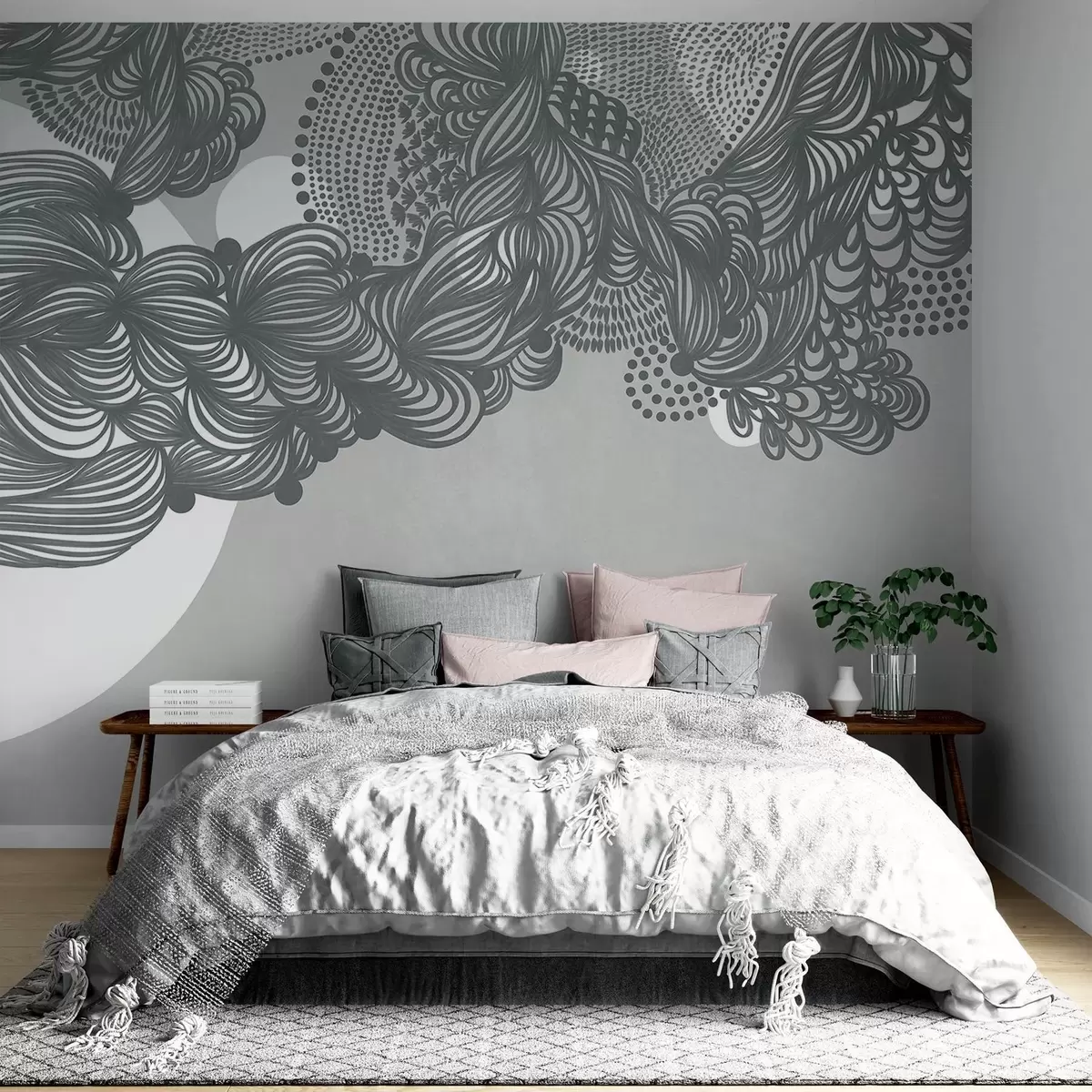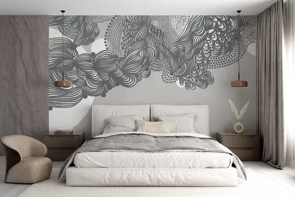 Carta da parati Disegno astratto con texture su sfondo grigio, con linee intricate e texture punteggiate. nr. w09621v1