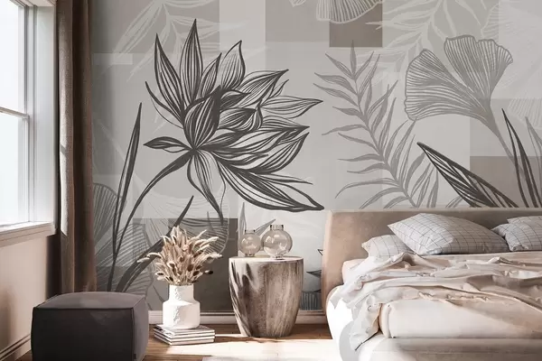 Carta da parati Fiori e foglie stilizzati con texture nei toni del marrone e del beige, su sfondo geometrico, disegno al tratto nr. w09629