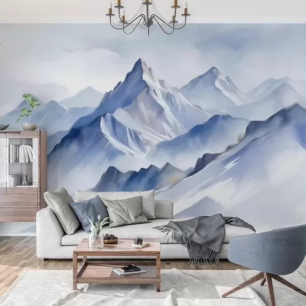 Carta da parati Montagne innevate con texture morbida, effetto acquerello e una tavolozza di colori blu e bianco. nr. w09630