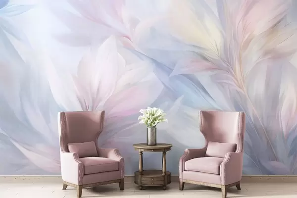 Carta da parati Foglie morbide dai colori pastello e piume nei toni del rosa, blu e giallo, stampa astratta e materica nr. w09634