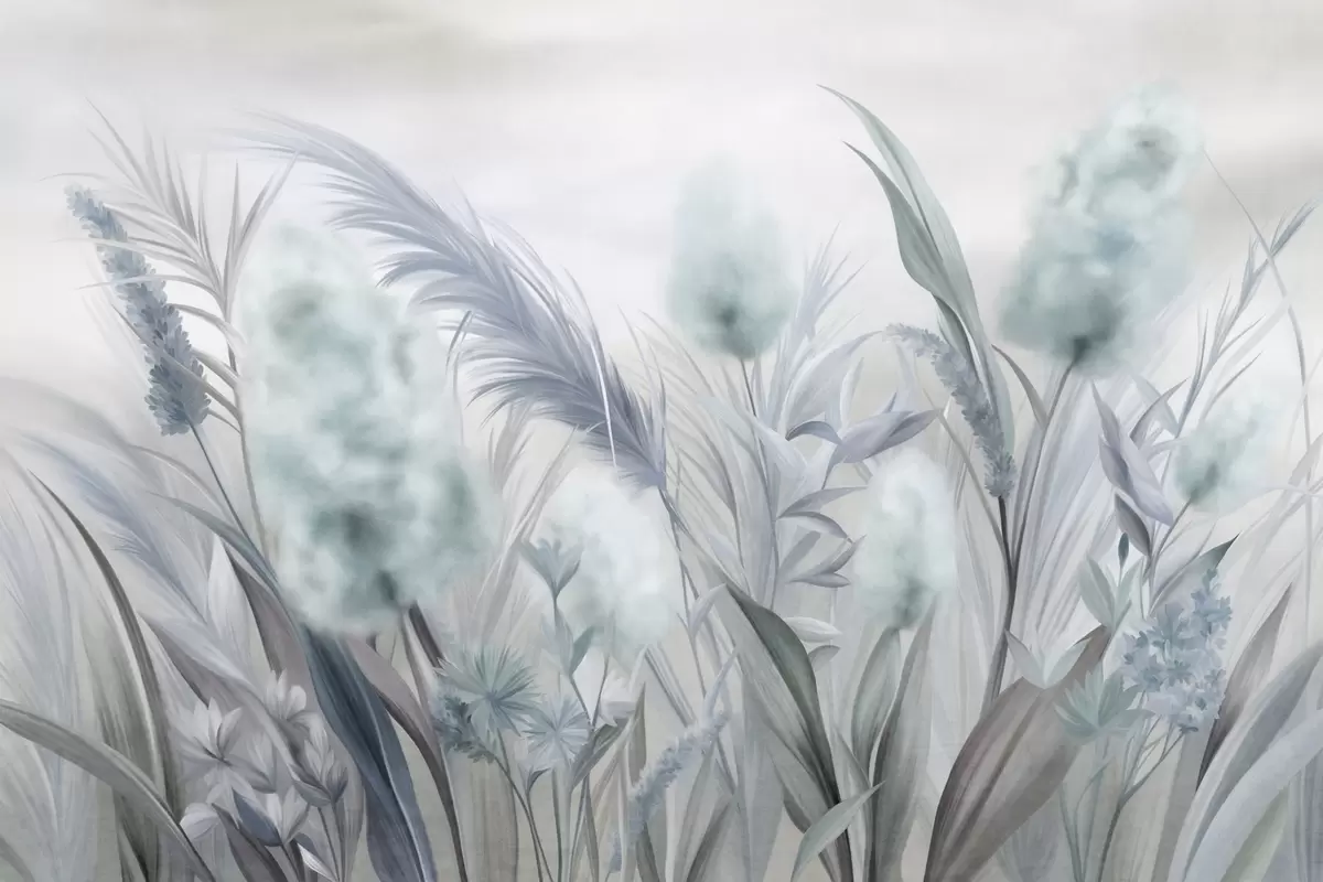 Carta da parati Erba della pampa blu e grigia e altri fiori secchi con un cielo morbido e nebbioso sullo sfondo nr. w09635v1