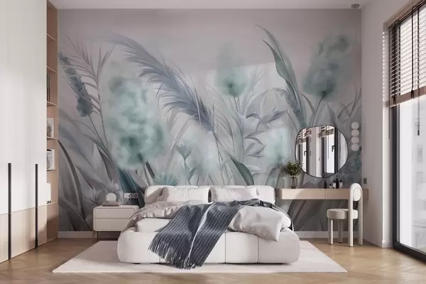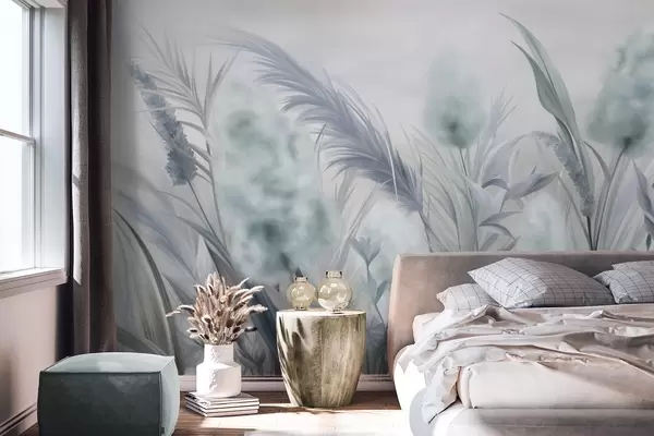 Carta da parati Erba della pampa blu e grigia e altri fiori secchi con un cielo morbido e nebbioso sullo sfondo nr. w09635v1
