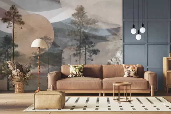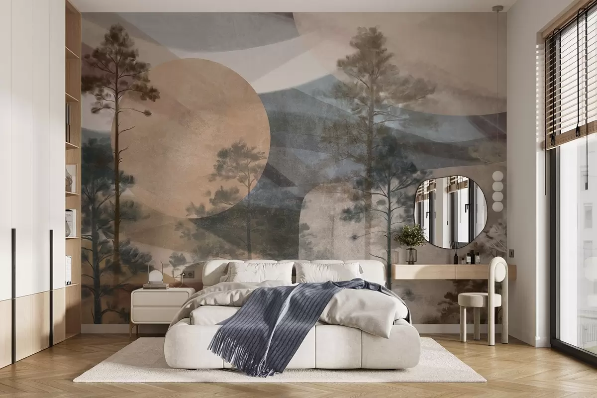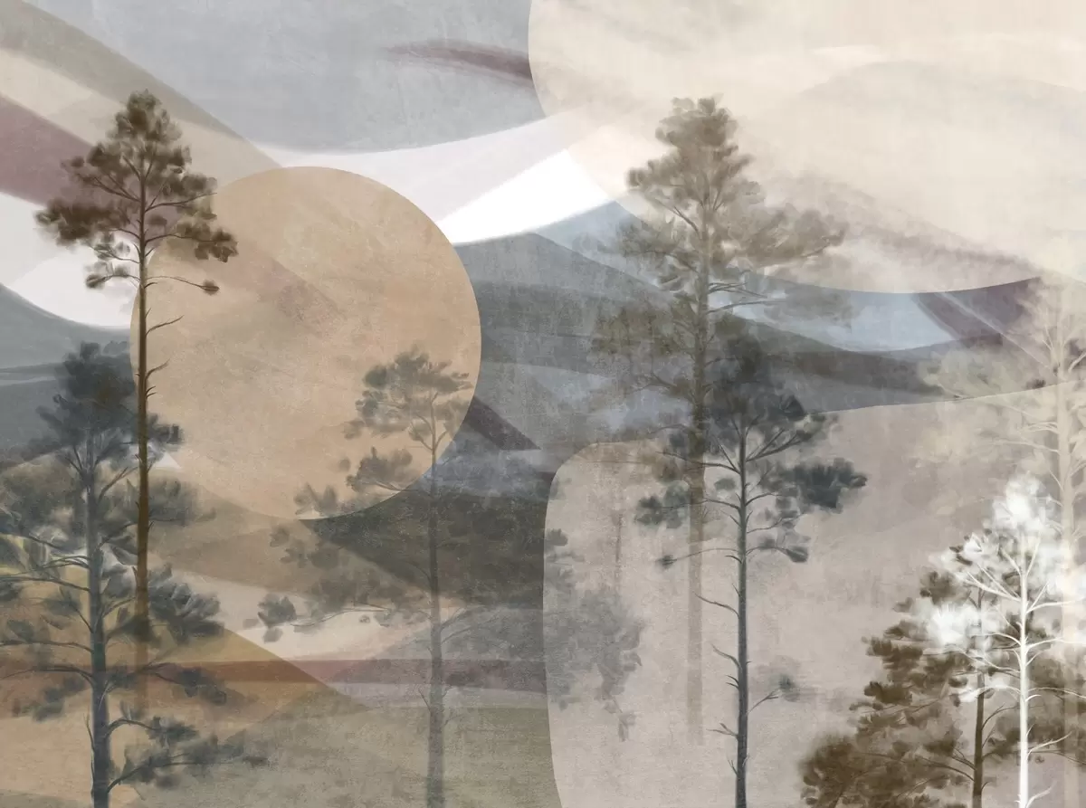 Carta da parati Alti pini in un paesaggio dai toni tenui con forme circolari astratte e montagne stratificate dai toni terrosi. nr. w09636