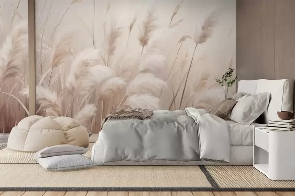 Carta da parati Erba della pampa alta e strutturata in tonalità morbide, calde e neutre, con uno sfondo sfocato e chiaro. nr. w09637
