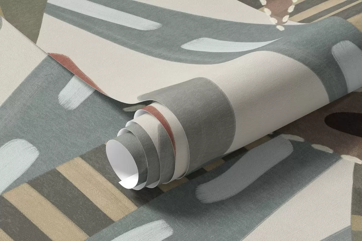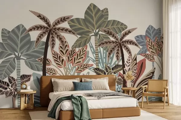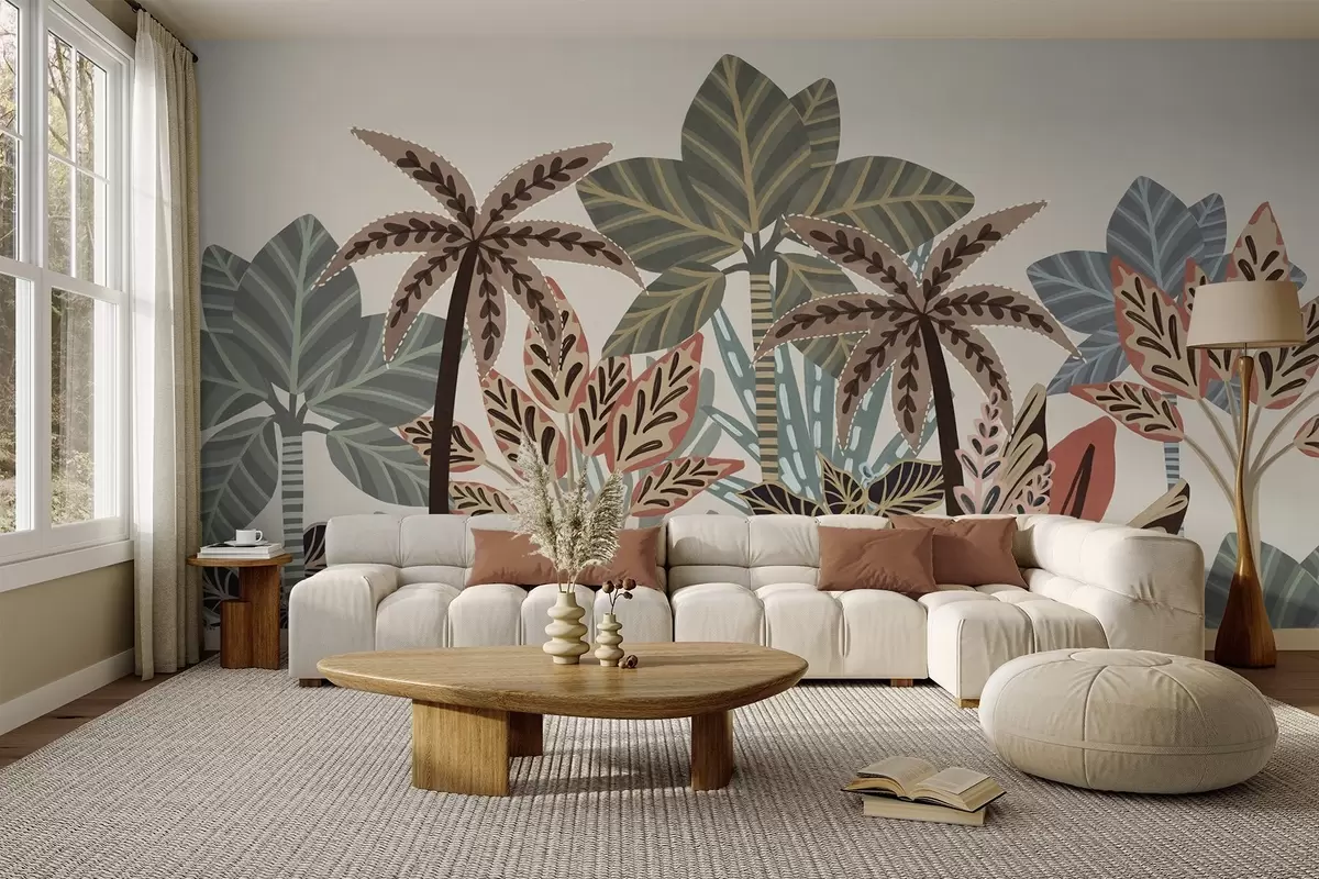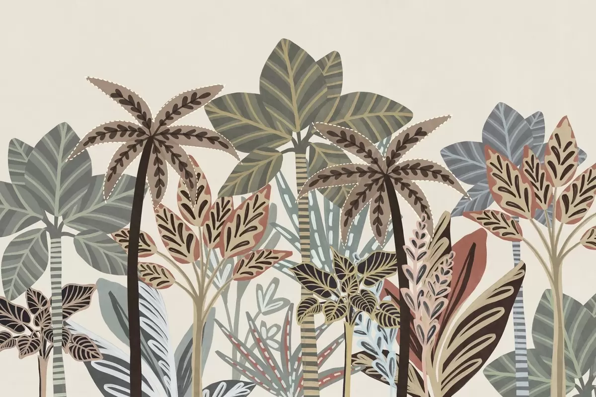 Carta da parati Piante tropicali e palme con texture dai colori tenui in stile boho decorativo su sfondo color crema nr. w09639
