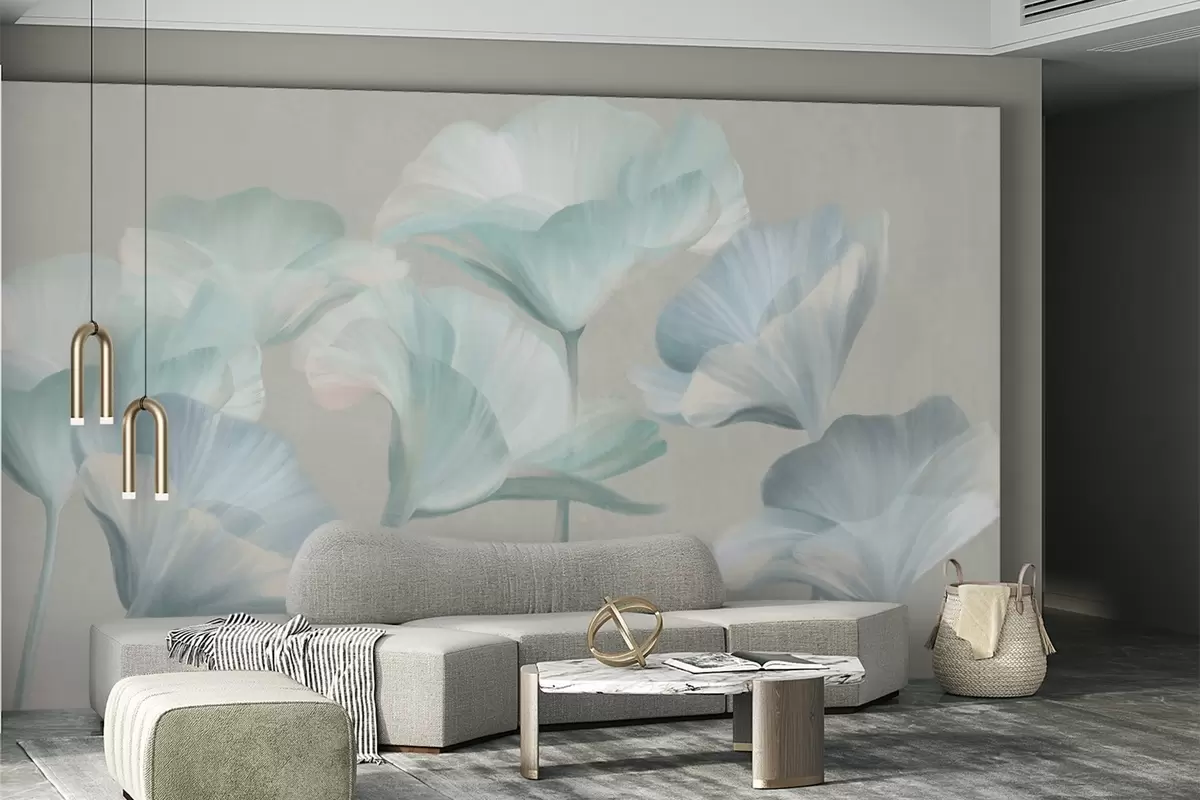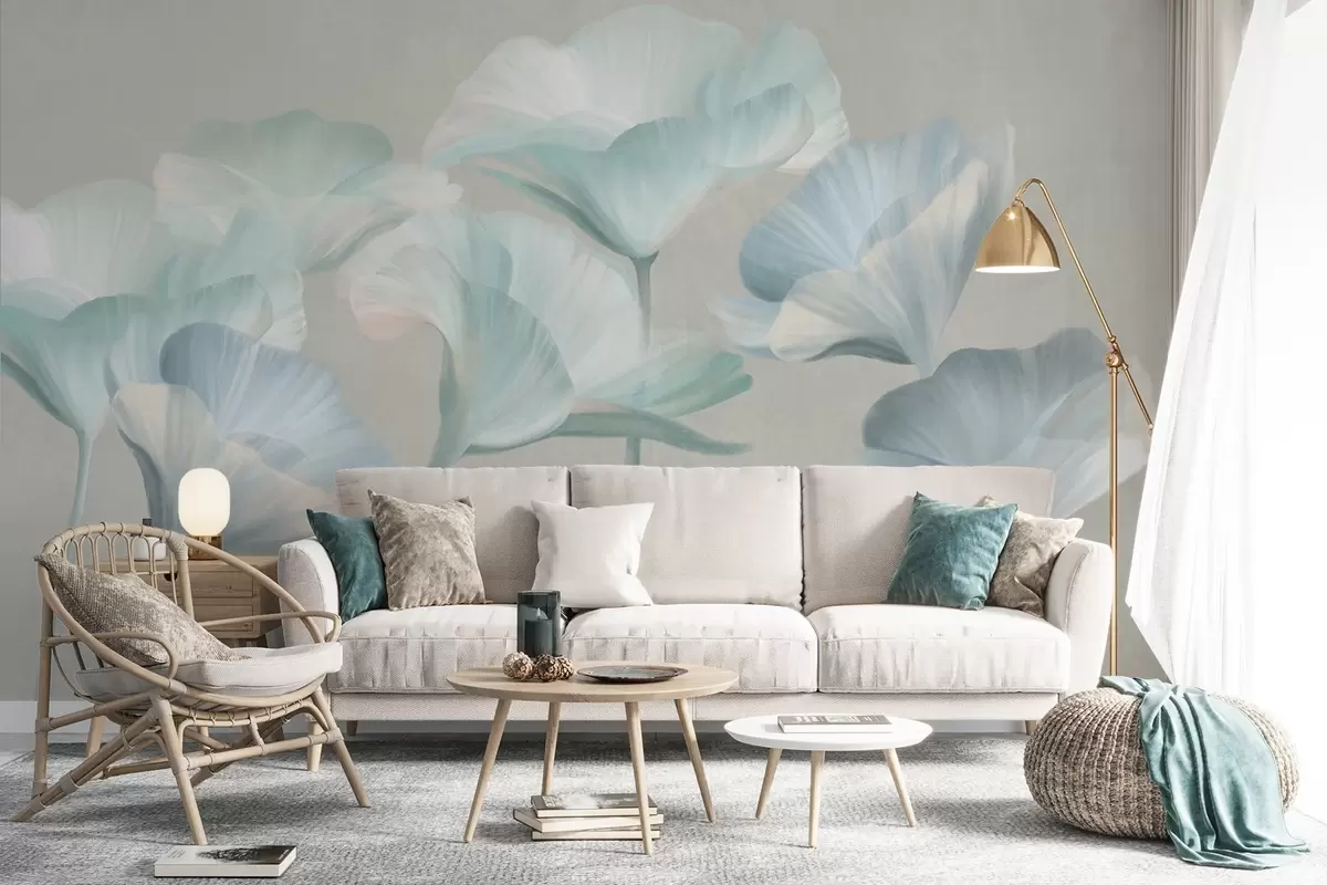 Carta da parati Fiori di loto traslucidi color turchese chiaro con petali delicati su uno sfondo grigio tenue nr. w09640v2
