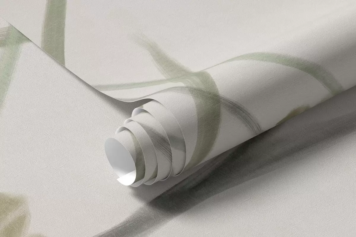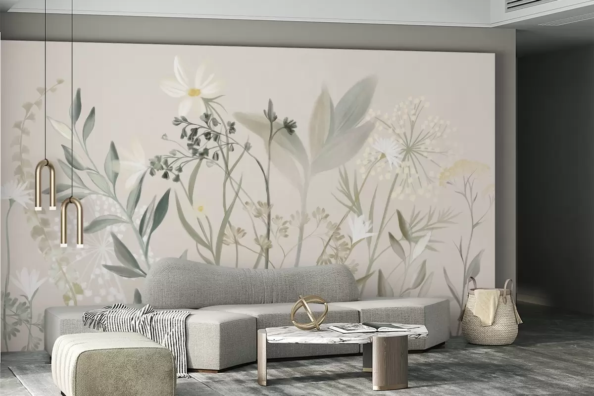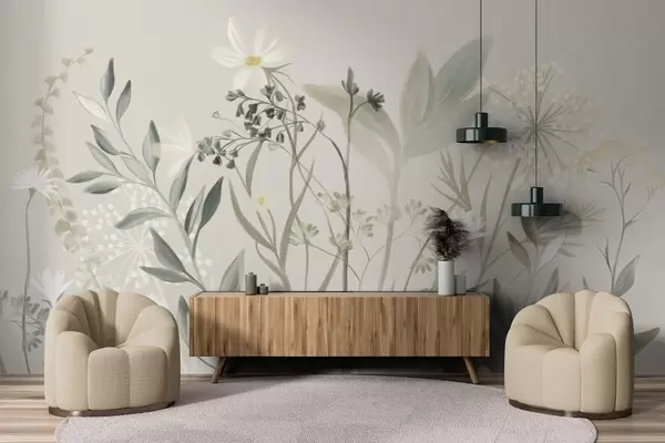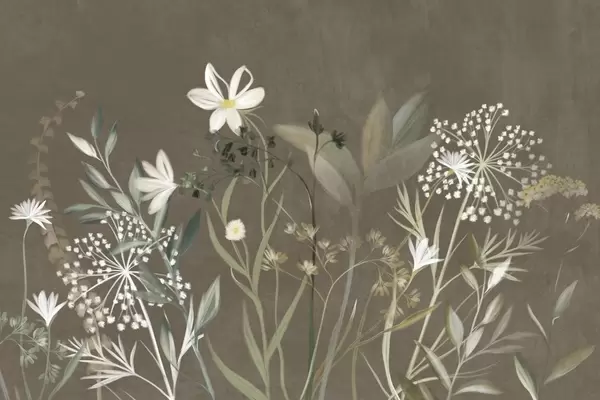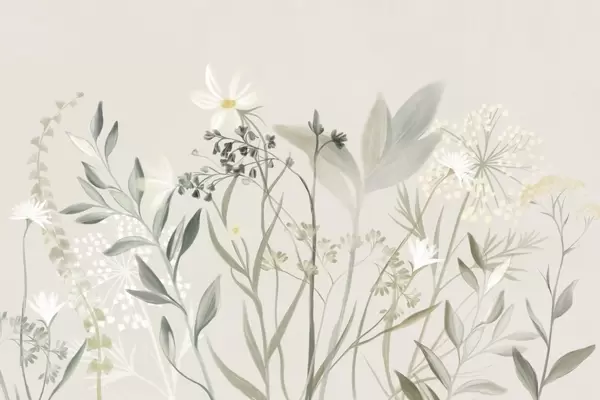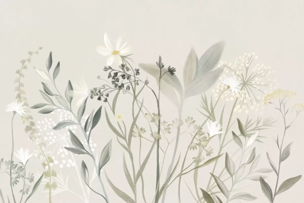 Carta da parati Delicati fiori selvatici e fogliame dalla texture delicata nei toni tenui del verde e del crema su uno sfondo beige chiaro. nr. w09641