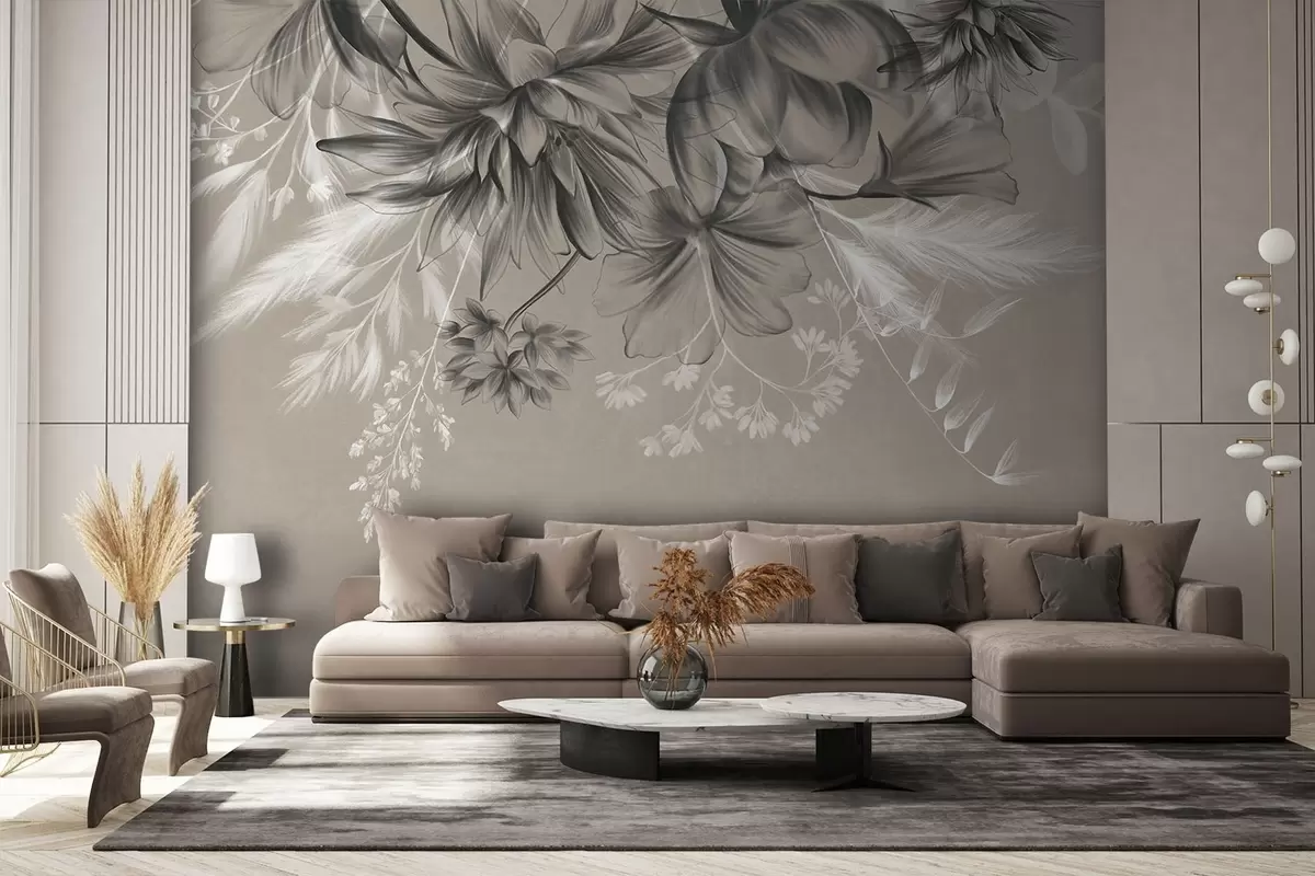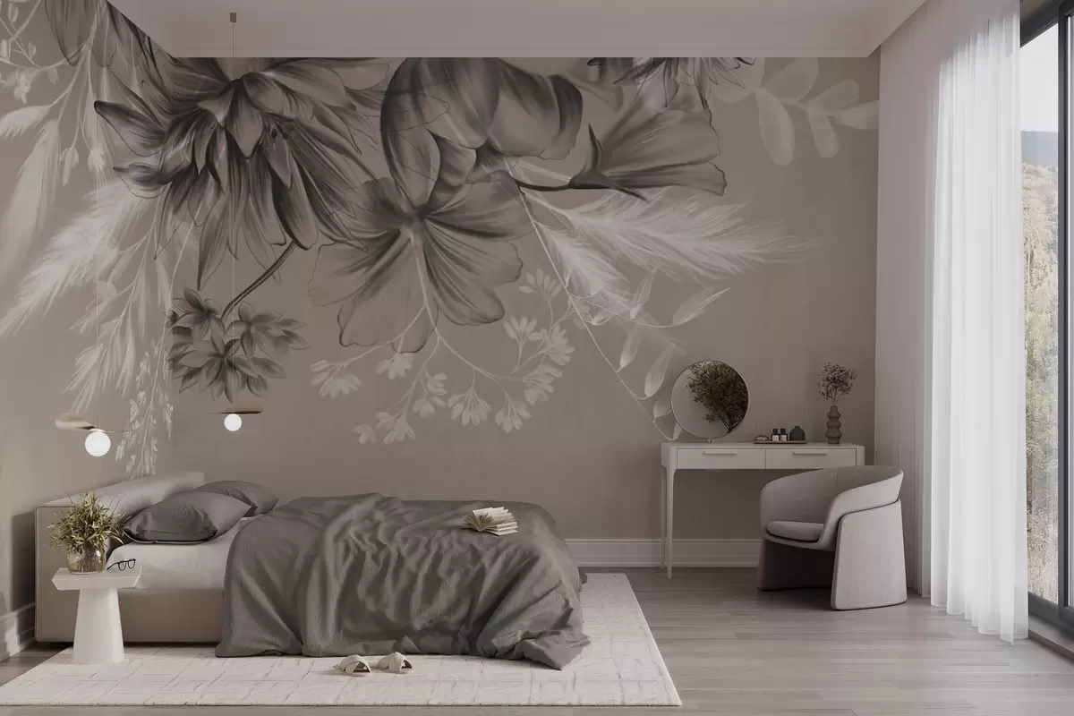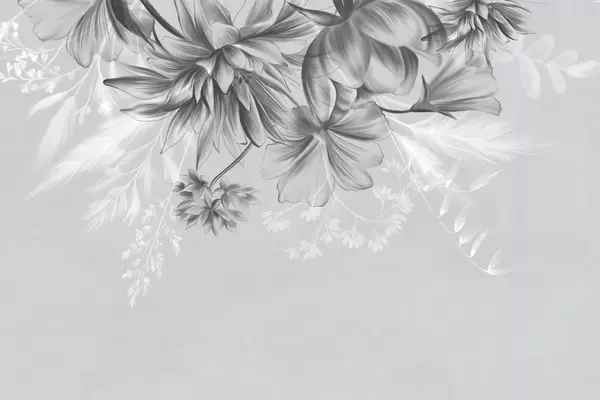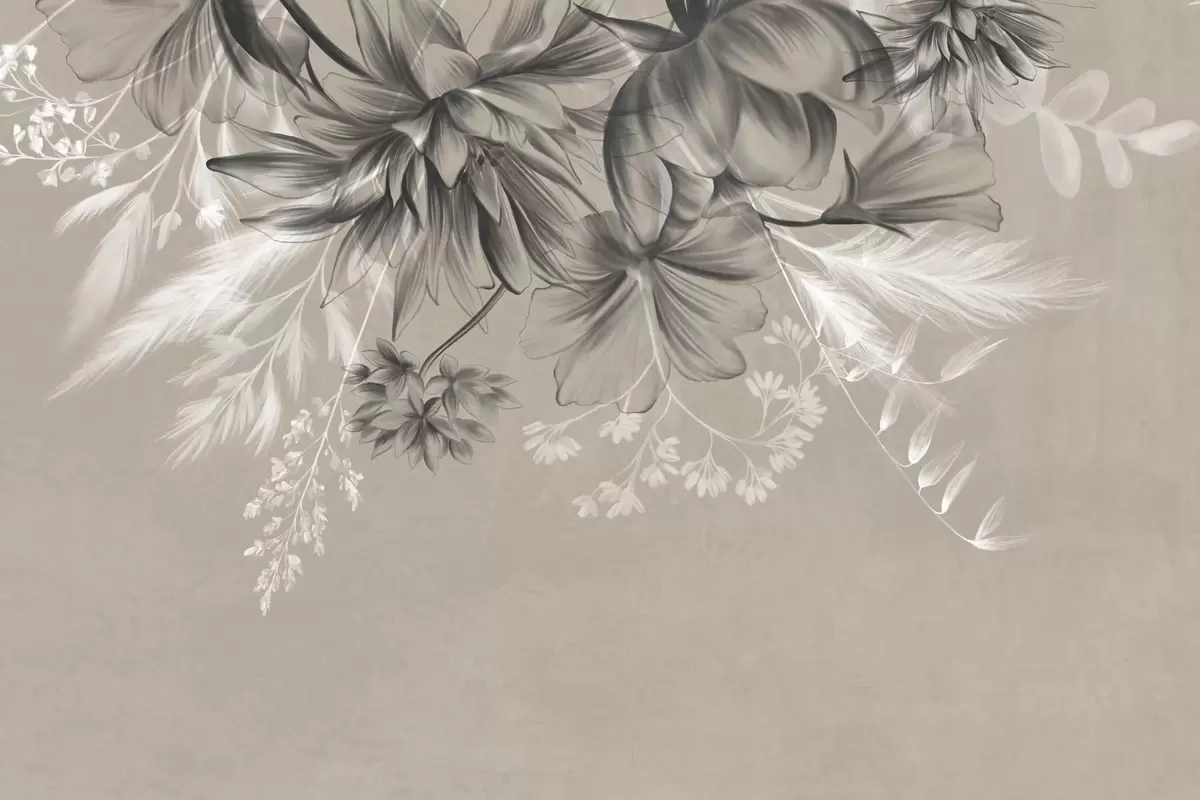 Carta da parati Fiori e felci testurizzati nei toni del grigio scuro e del bianco su uno sfondo beige tenue, stile grafico. nr. w09644