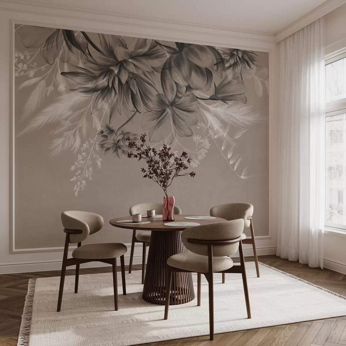 Carta da parati Fiori e felci testurizzati nei toni del grigio scuro e del bianco su uno sfondo beige tenue, stile grafico. nr. w09644