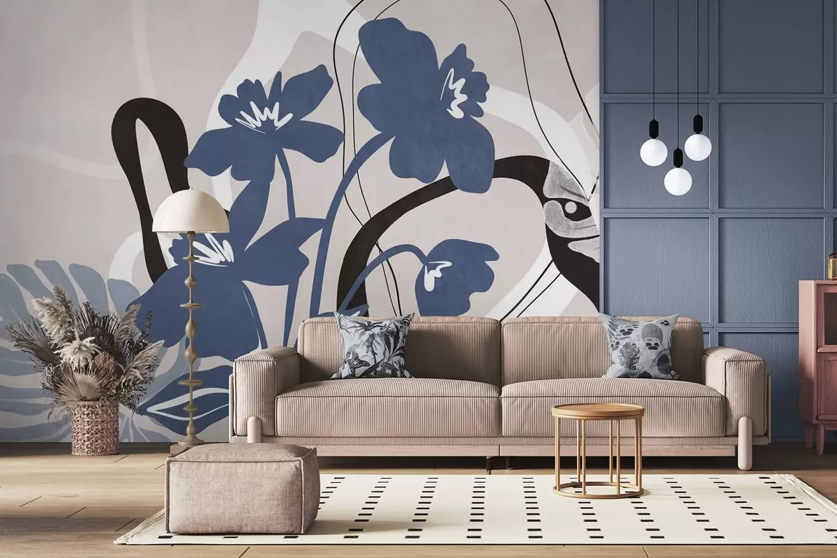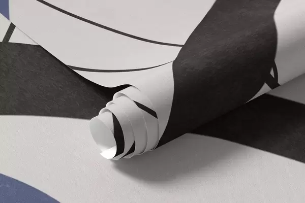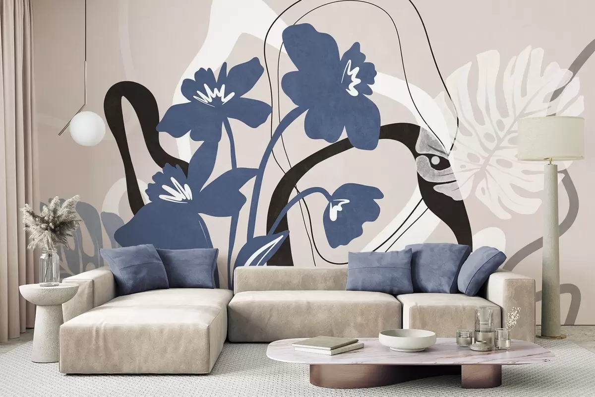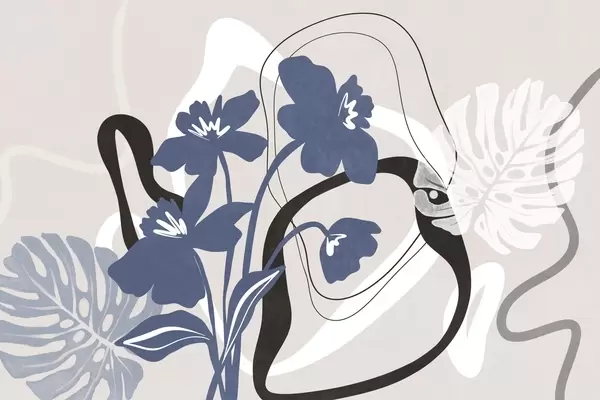 Carta da parati Fiori blu astratti con texture e forme bianche e nere su sfondo beige chiaro, arte minimalista nr. w09645