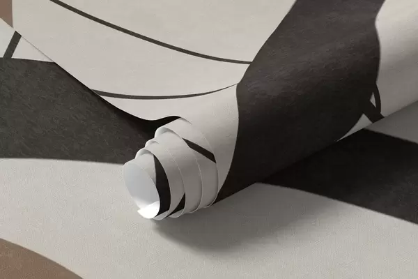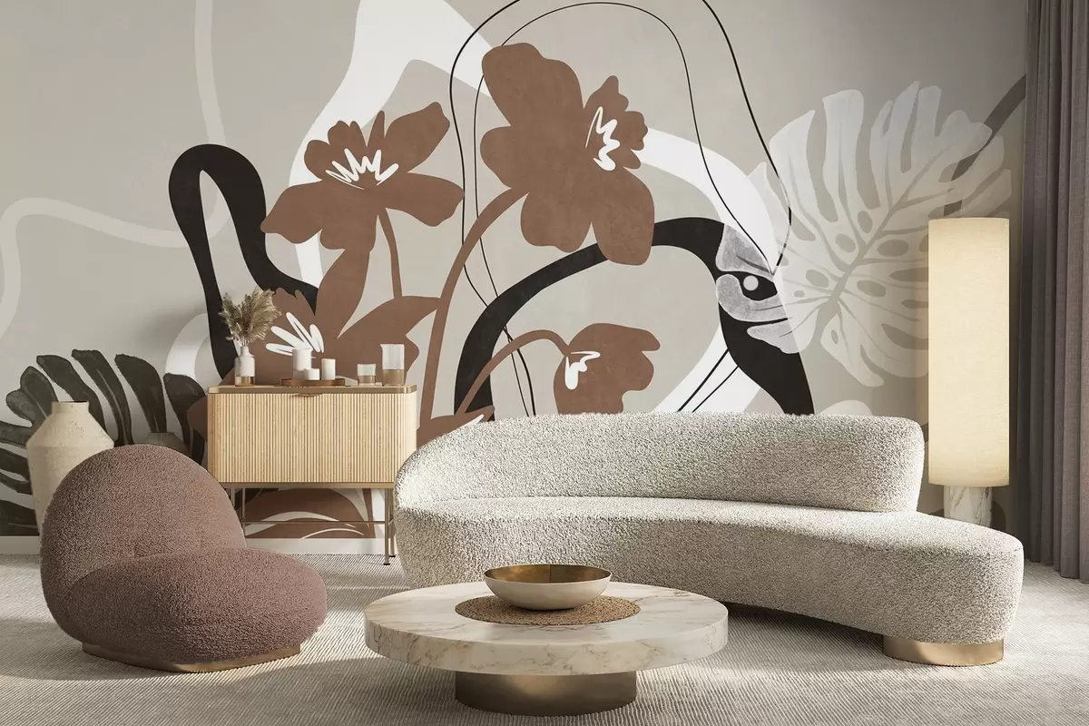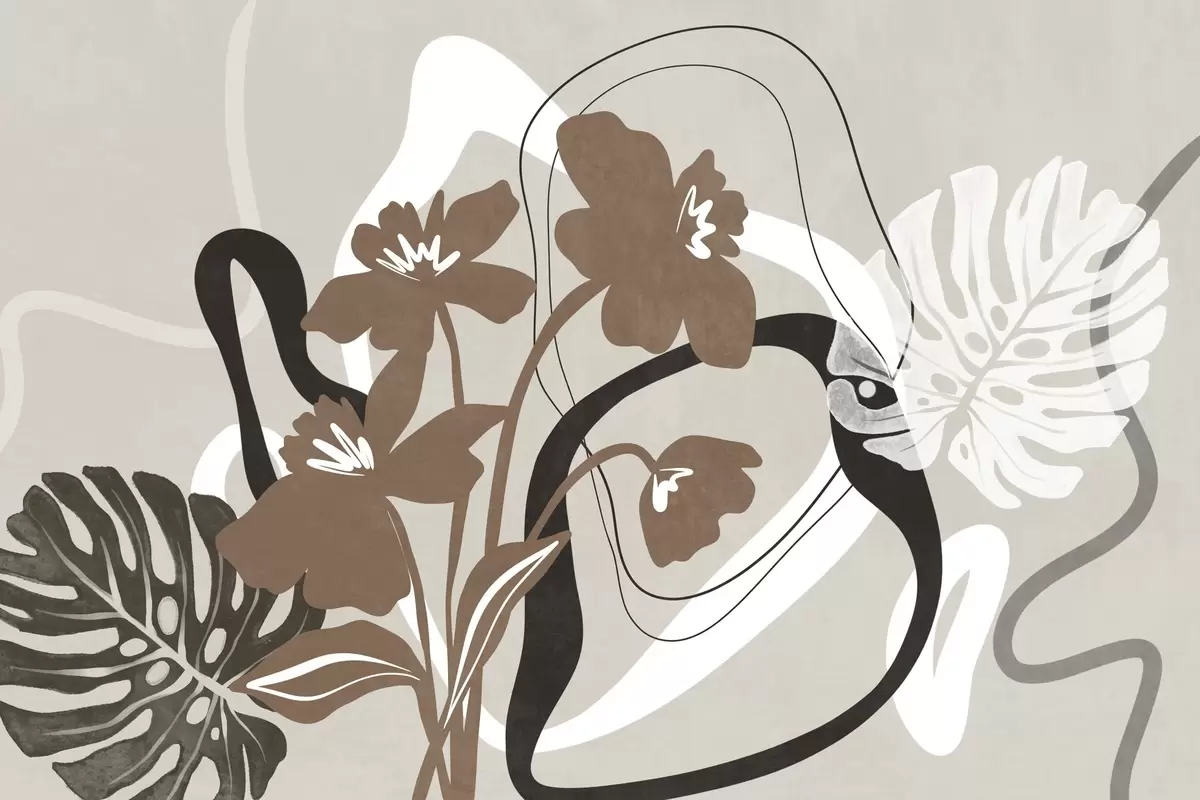Carta da parati Fiori marroni astratti con texture e forme bianche e nere su sfondo beige, arte minimalista nr. w09645v1