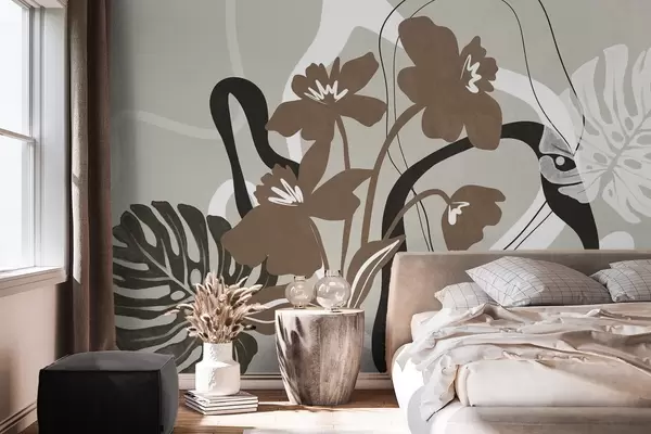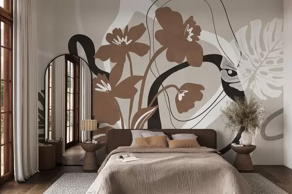 Carta da parati Fiori marroni astratti con texture e forme bianche e nere su sfondo beige, arte minimalista nr. w09645v1
