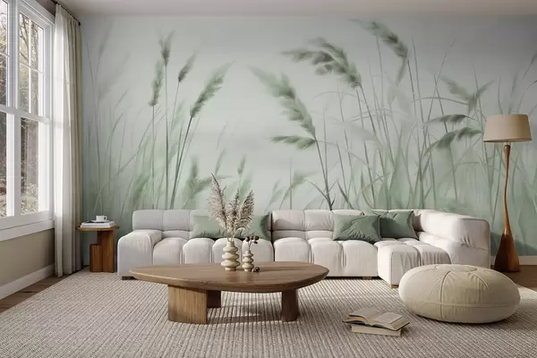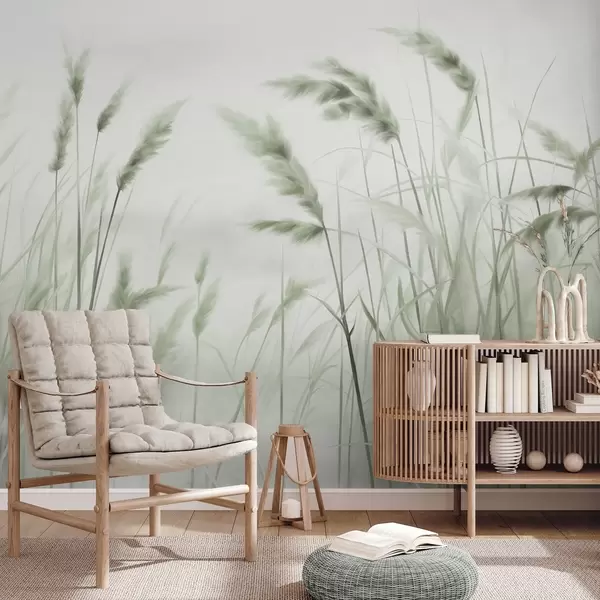 Carta da parati Erba alta e secca con spighe di grano nel campo su uno sfondo morbido e chiaro nr. w09648v1