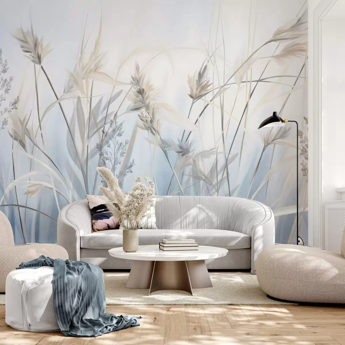 Carta da parati Alti steli d'erba secca con punte piumate dai toni tenui, sfondo morbido e sfumato di blu e bianco nr. w09652