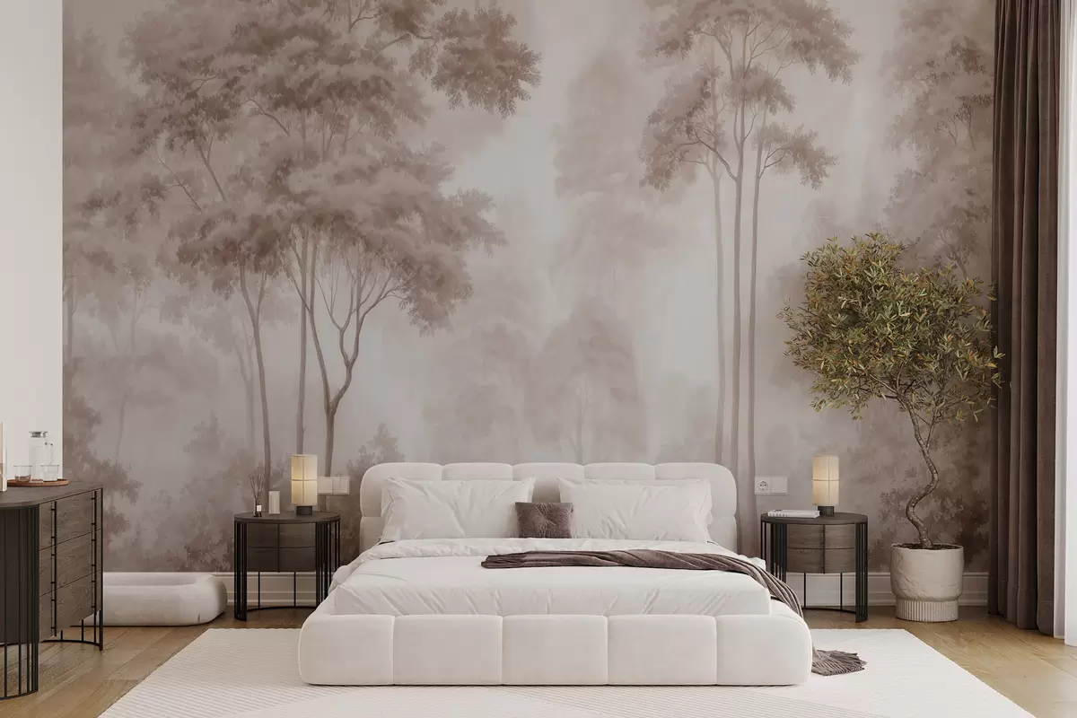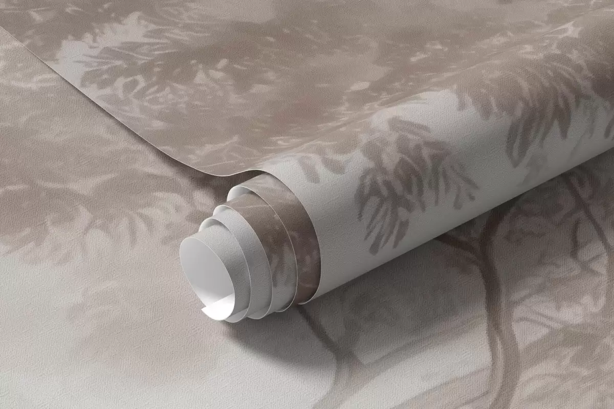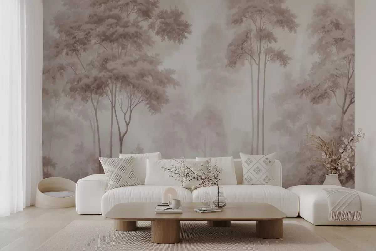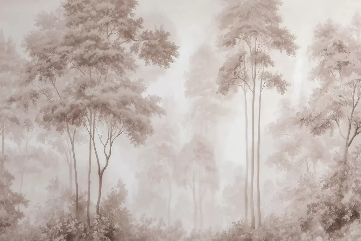 Carta da parati Paesaggio boschivo astratto dai toni beige fumé che trasmette un senso di profondità nr. w09657
