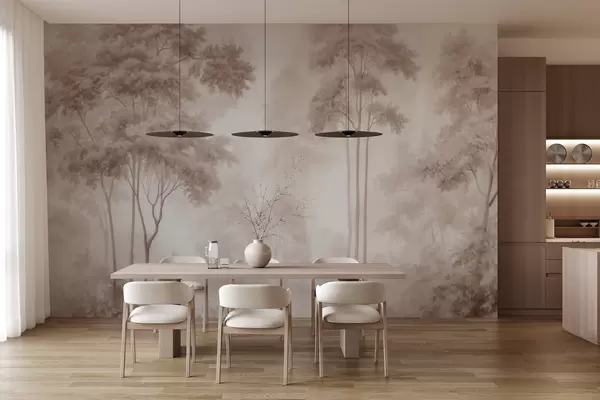 Carta da parati Paesaggio boschivo astratto dai toni beige fumé che trasmette un senso di profondità nr. w09657