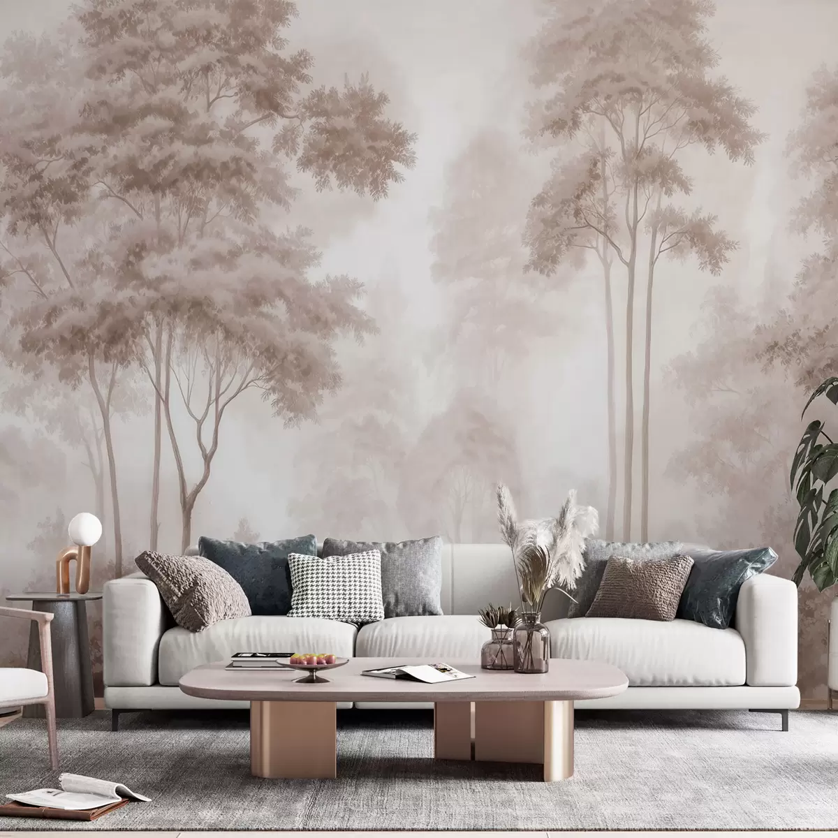 Carta da parati Paesaggio boschivo astratto dai toni beige fumé che trasmette un senso di profondità nr. w09657