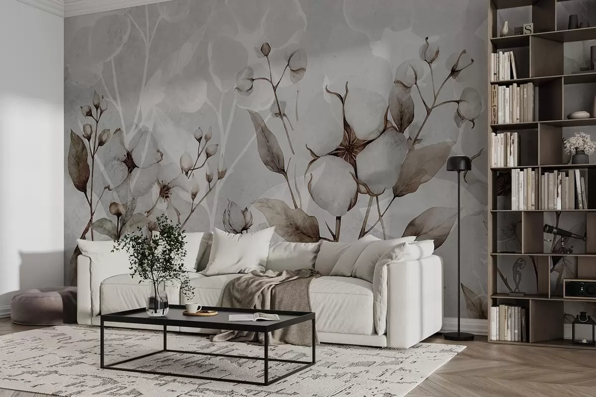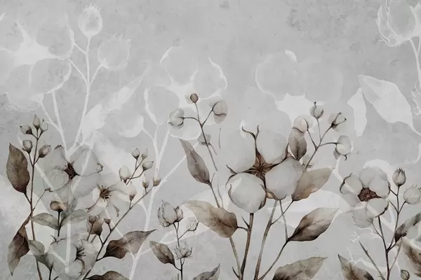 Carta da parati Grandi fiori di cotone su sfondo grigio chiaro nr. w09691
