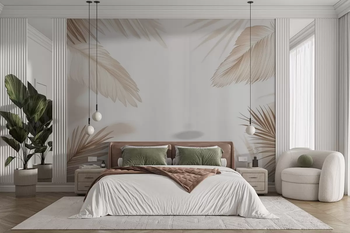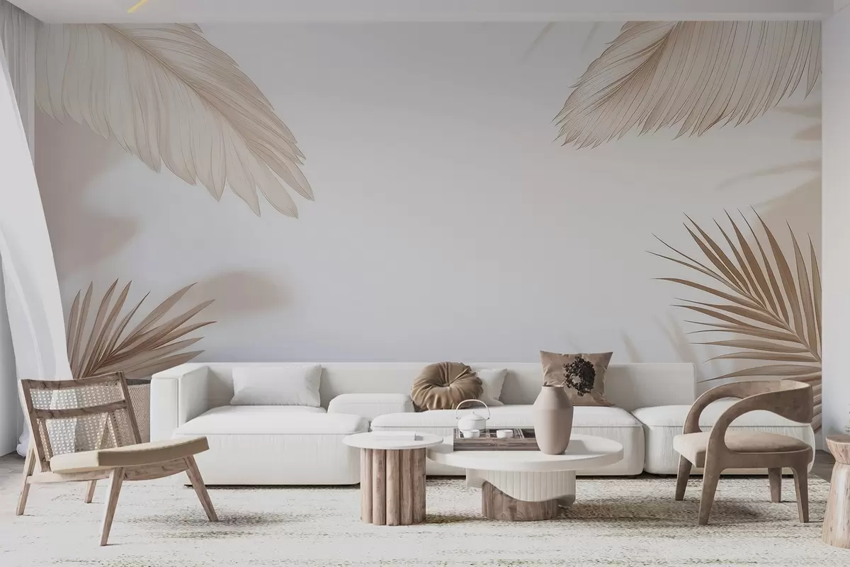 Carta da parati Arredamento tropicale nei toni del beige con sagome di foglie di palma e morbide ombre nr. w09714