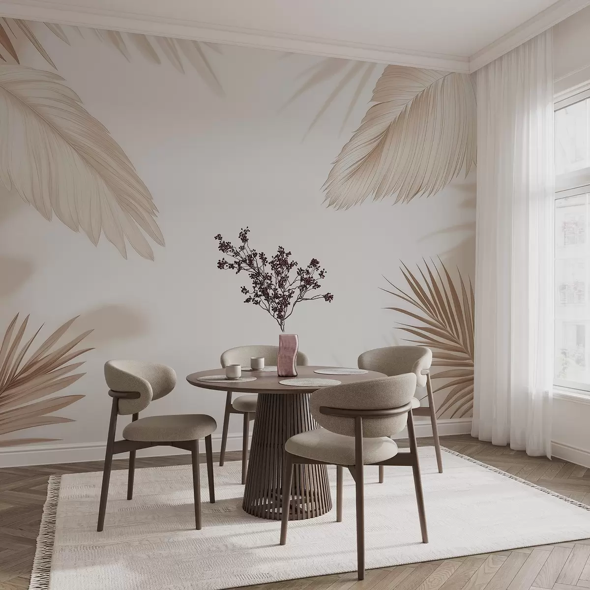Carta da parati Arredamento tropicale nei toni del beige con sagome di foglie di palma e morbide ombre nr. w09714