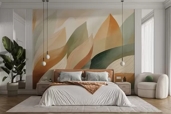 Carta da parati Foglie astratte, tenui tonalità terrose di verde e arancione con delicati dettagli lineari, morbida texture acquerellata. nr. w09736