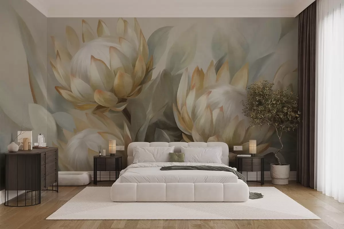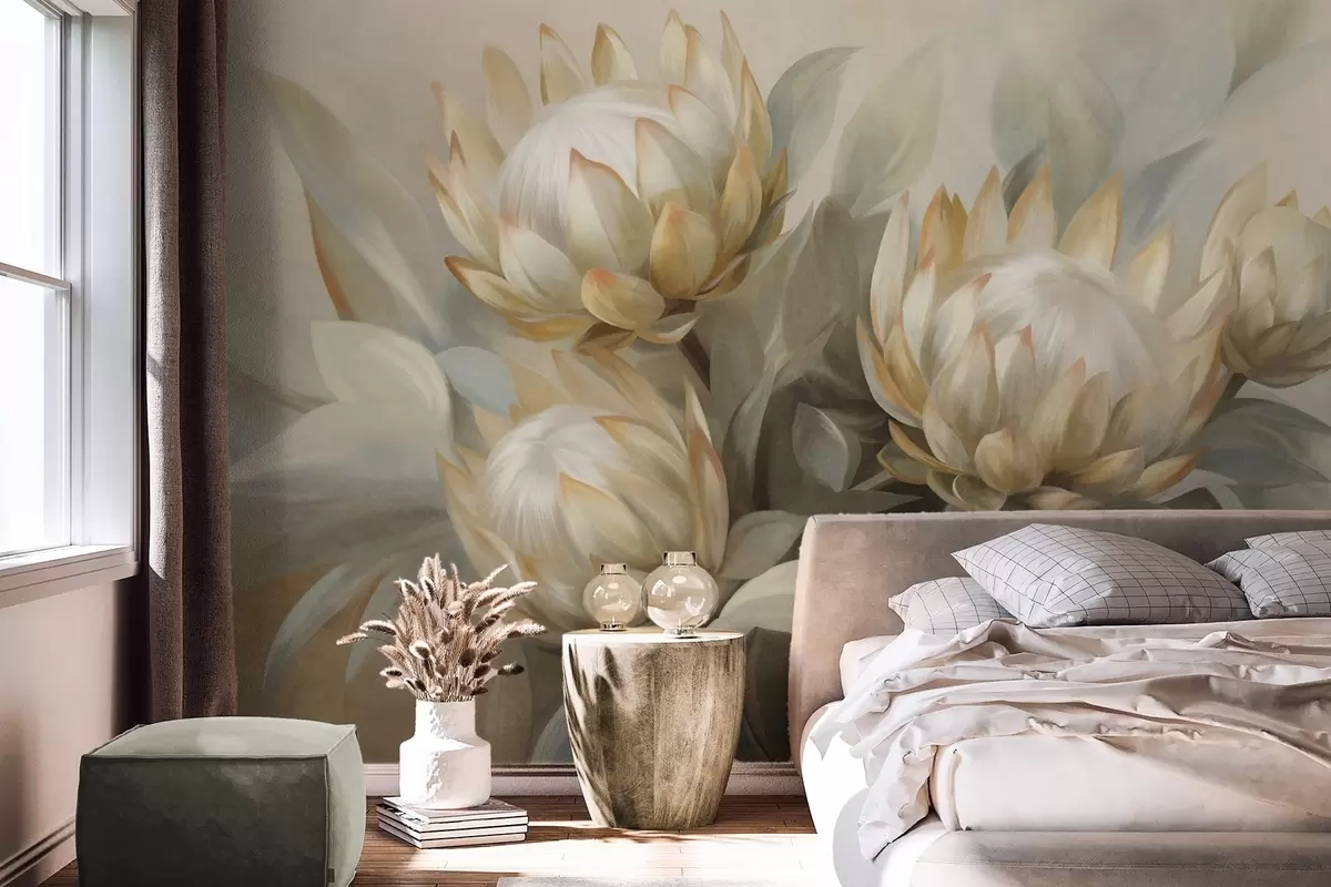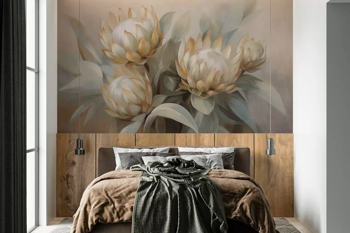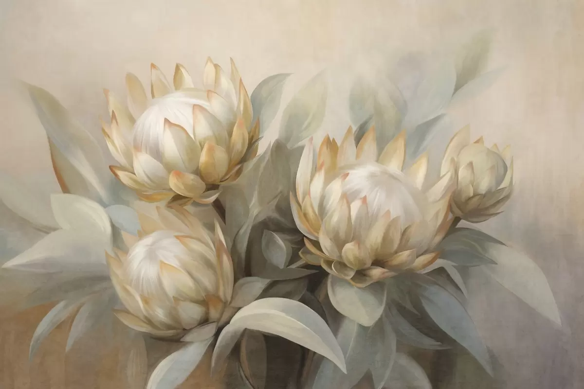 Carta da parati Fiori di protea con texture, foglie verdi e sfondo morbido e sfocato nr. w09738