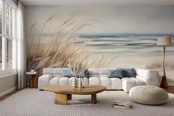 Carta da parati Paesaggio strutturato con erba secca su una spiaggia sabbiosa, con l'oceano e il cielo sullo sfondo nr. w09739