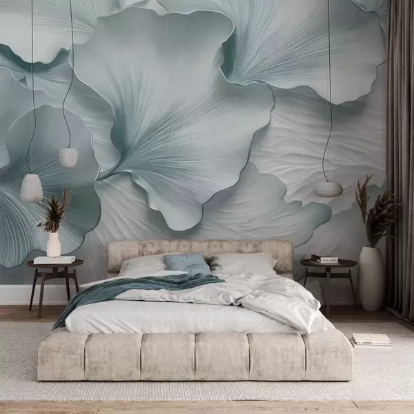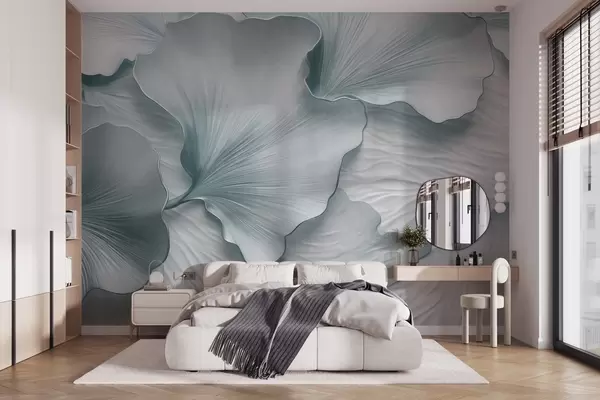 Carta da parati Petali di foglie di ginkgo blu e bianchi con texture e delicata stampa organica nr. w09741v1
