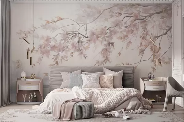 Carta da parati Paesaggio strutturato con ramo di ciliegio in fiore, foglie rosa, sfondo morbido e nebbioso nr. w09743