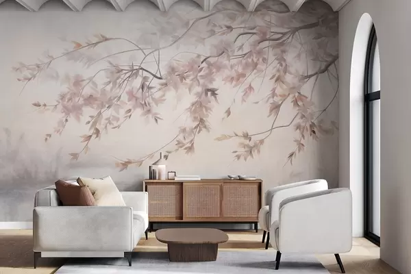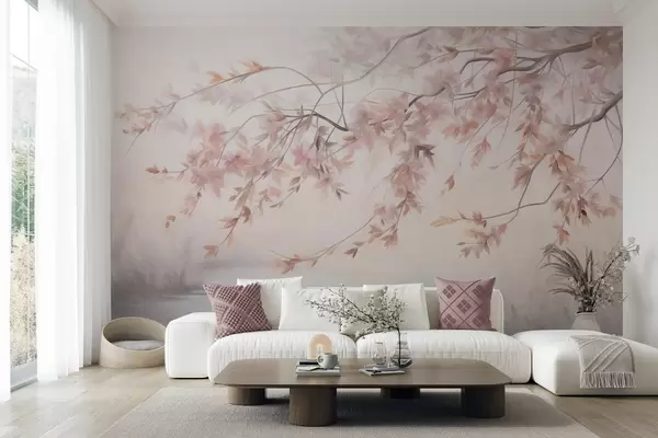 Carta da parati Paesaggio strutturato con ramo di ciliegio in fiore, foglie rosa, sfondo morbido e nebbioso nr. w09743