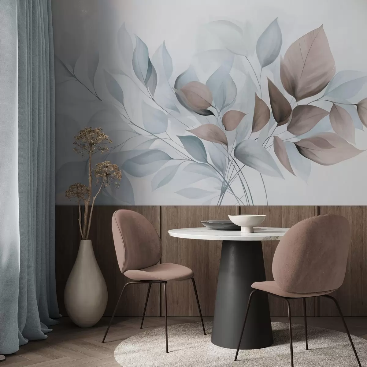 Carta da parati Foglie astratte traslucide nei toni del blu, beige e marrone, arte materica nr. w09744v1