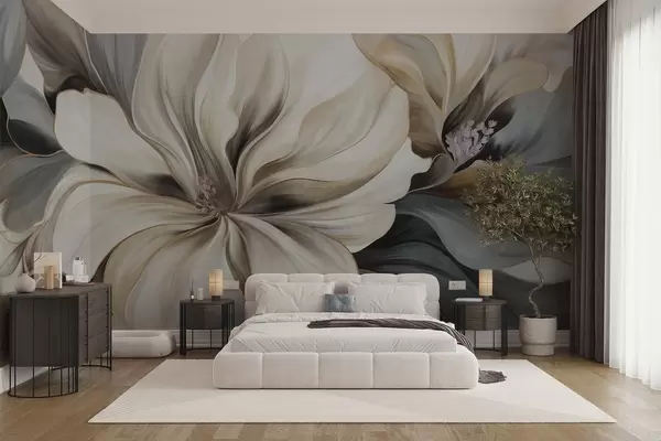 Carta da parati Grandi fiori di magnolia color crema con foglie marroni e grigie, illuminazione soffusa, sfondo astratto nr. w09749