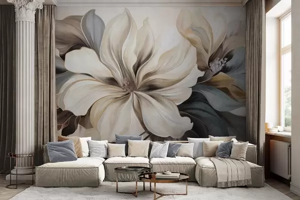 Carta da parati Grandi fiori di magnolia color crema con foglie marroni e grigie, illuminazione soffusa, sfondo astratto nr. w09749