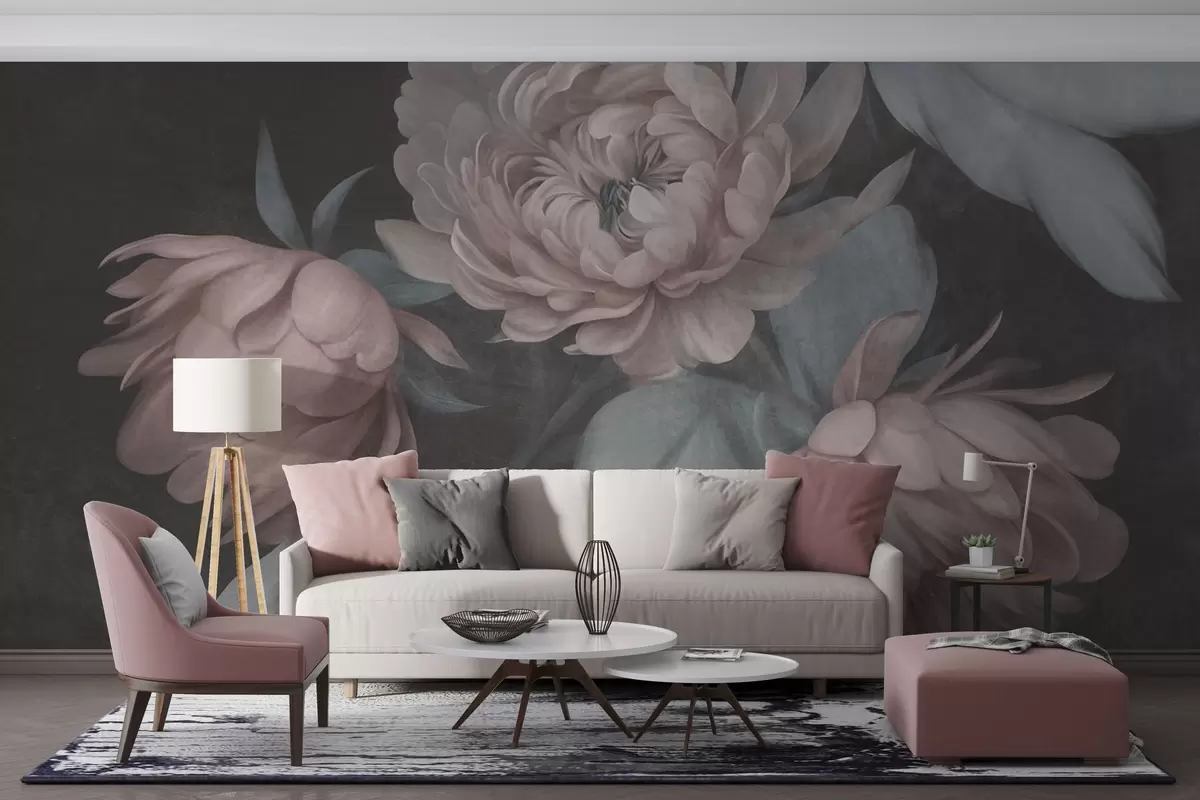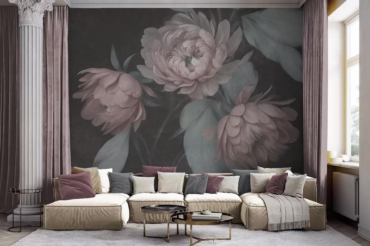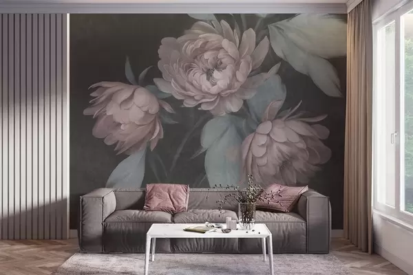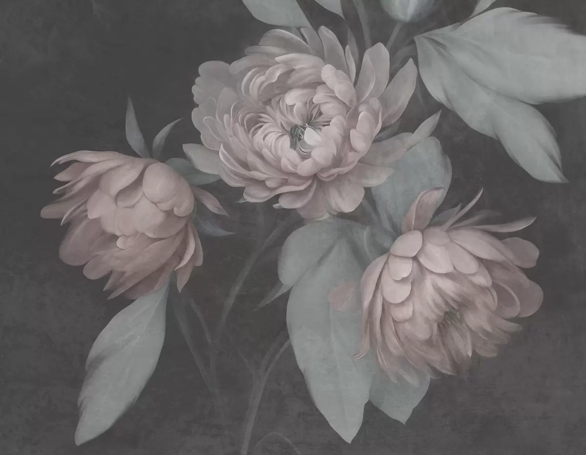 Carta da parati Fiori di peonia rosa chiaro con texture e foglie verde tenue su uno sfondo scuro nr. w09751v1