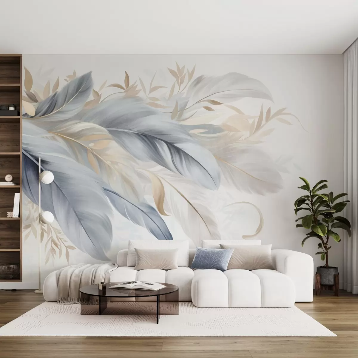 Carta da parati Piume dai colori pastello con texture e foglie delicate su uno sfondo chiaro nr. w09763