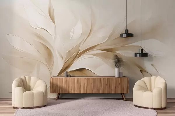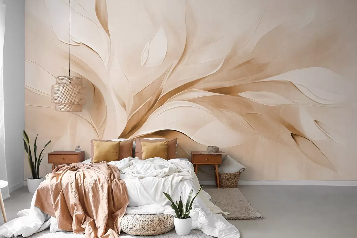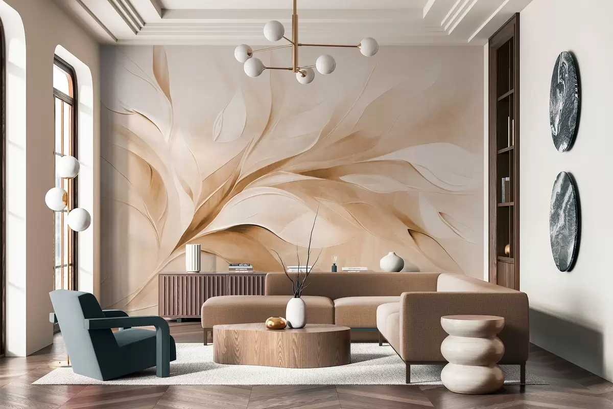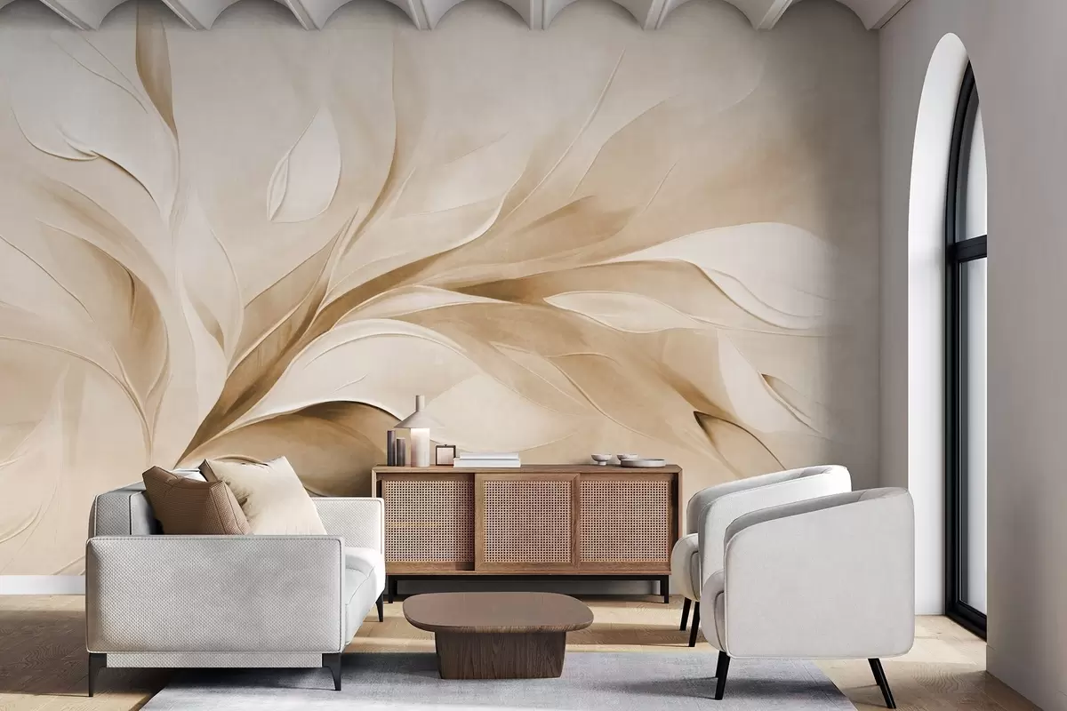 Carta da parati Stile pittorico astratto con texture di foglie fluttuanti nei toni del beige e del bianco nr. w09765v1