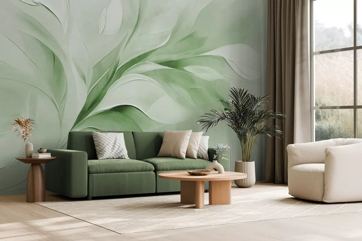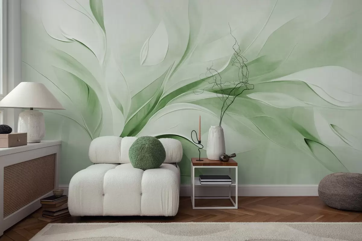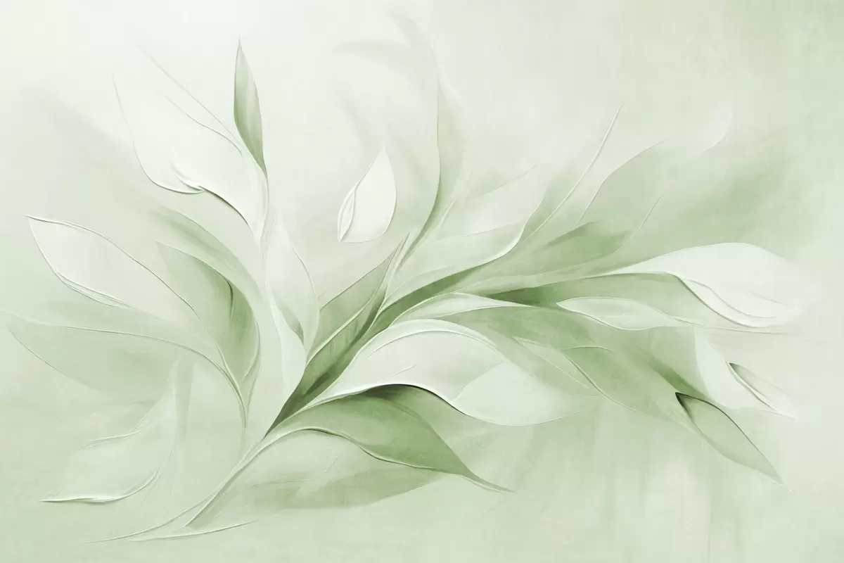 Carta da parati Stile pittorico astratto con texture di foglie verdi e bianche che fluttuano nr. w09765v2