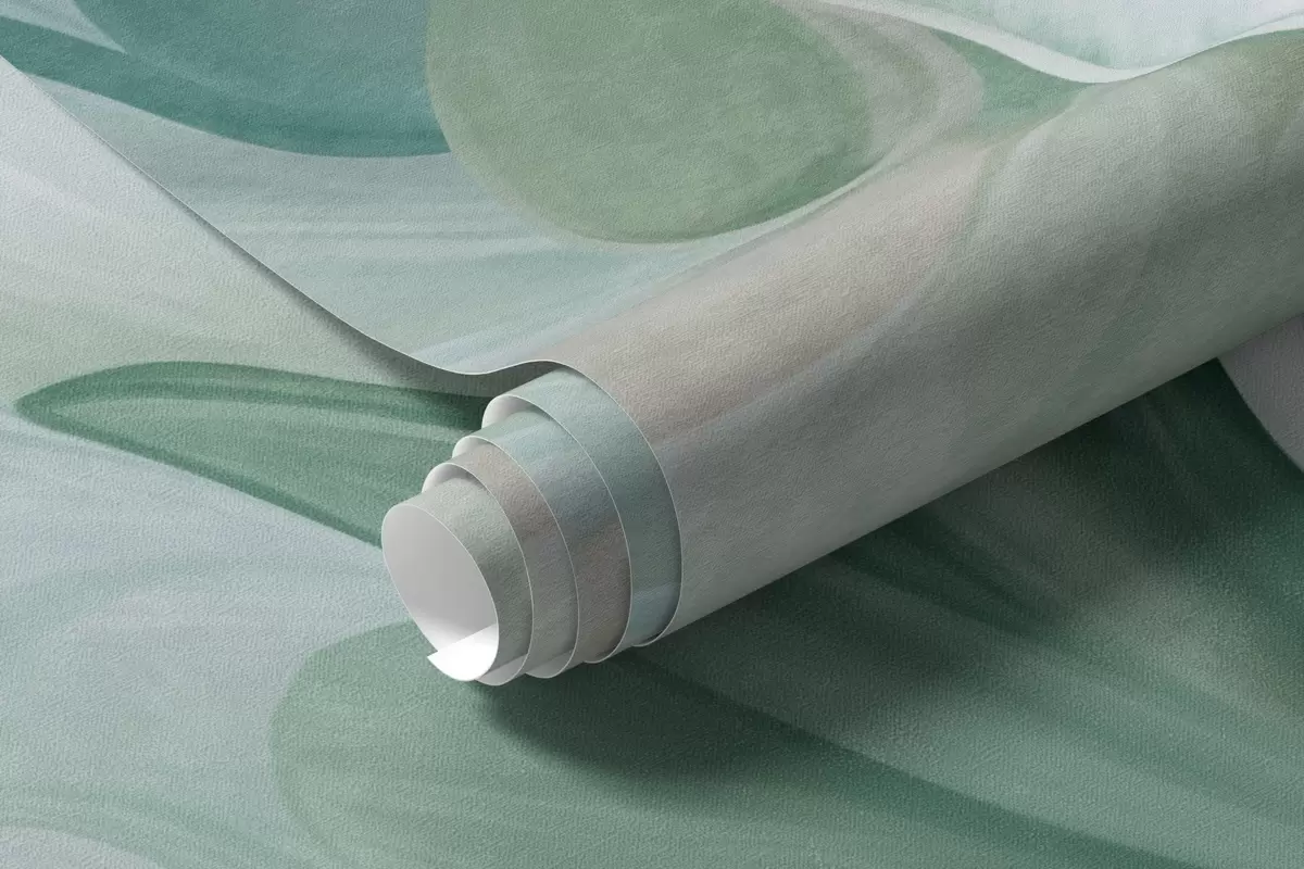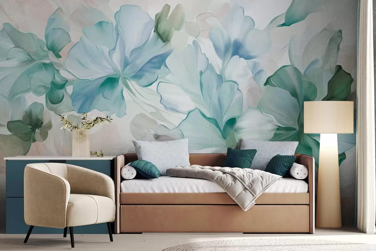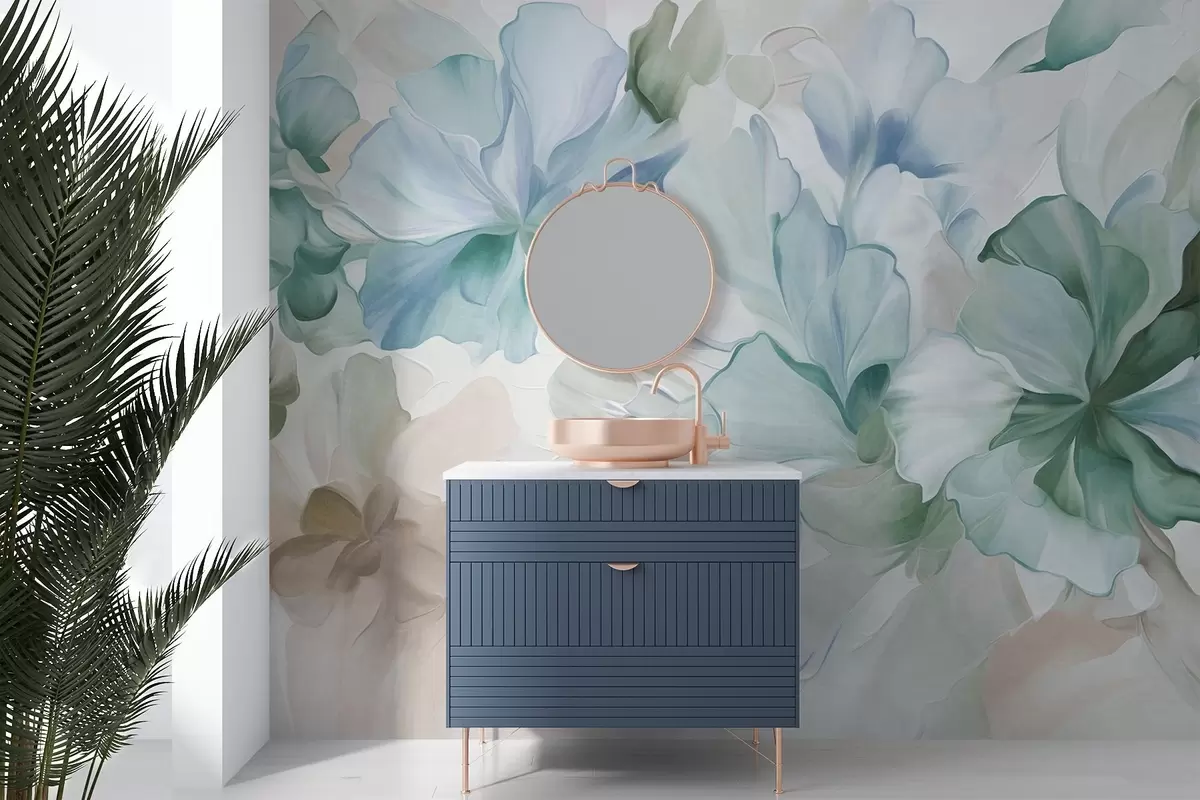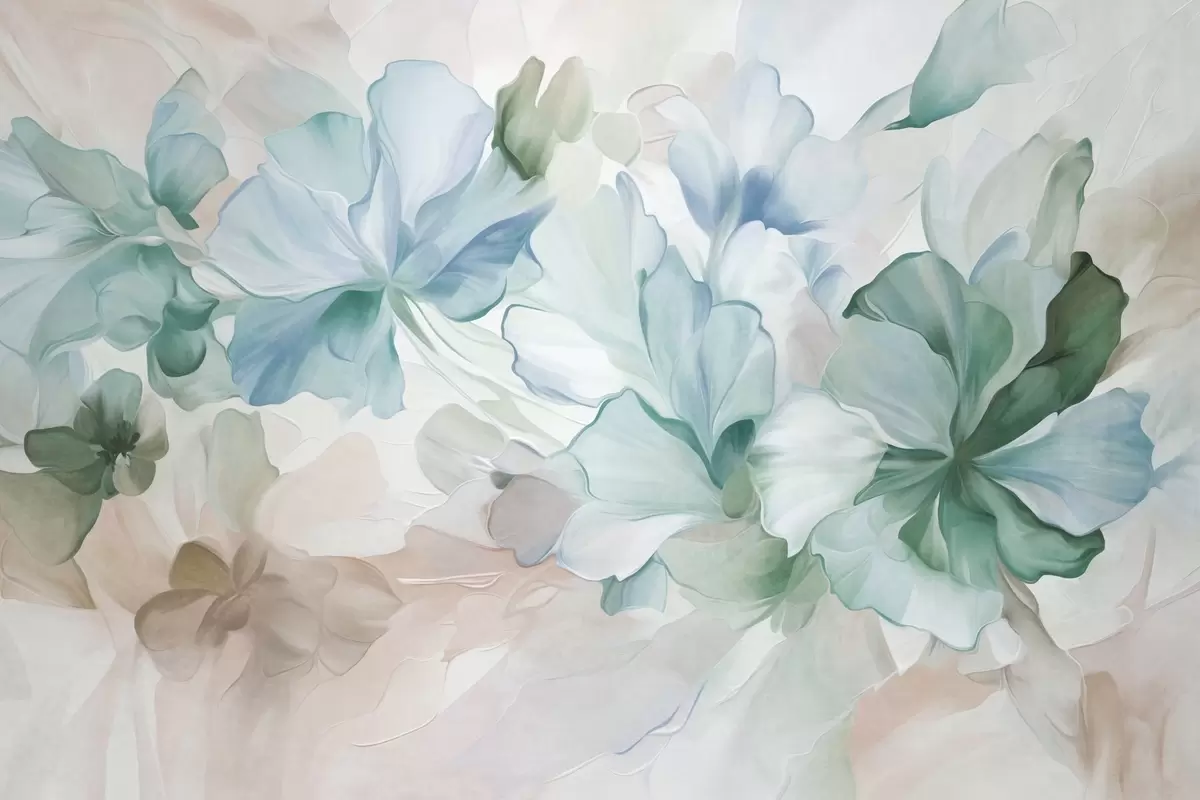 Carta da parati Fiori astratti e fantastici nei toni del verde, del blu e del beige, in stile pittorico, arte materica nr. w09767v1