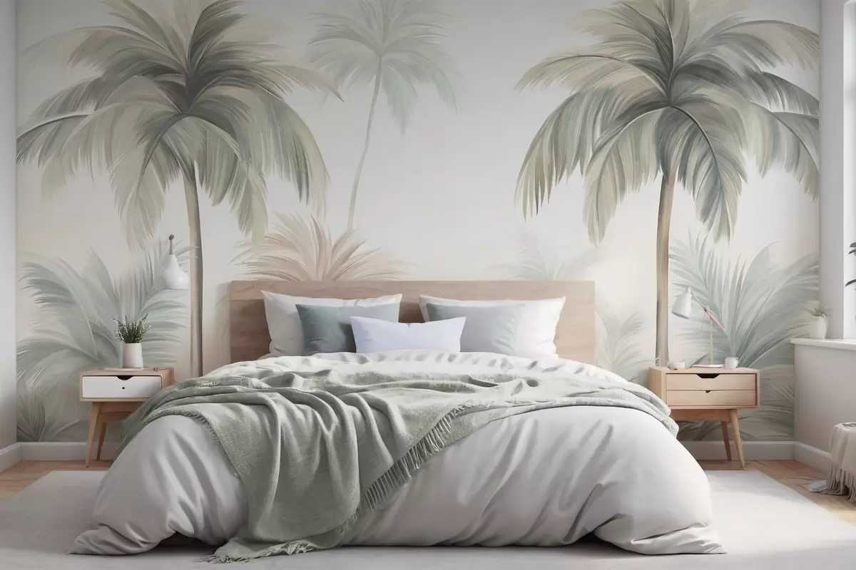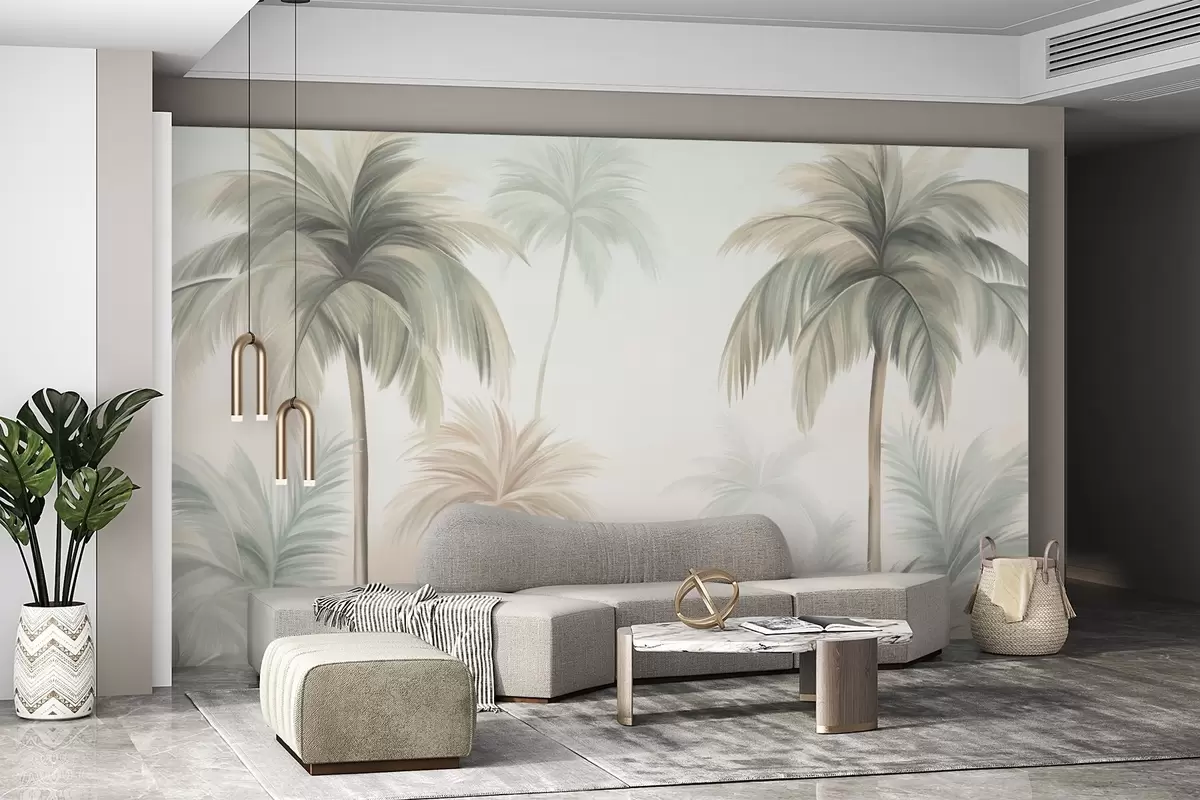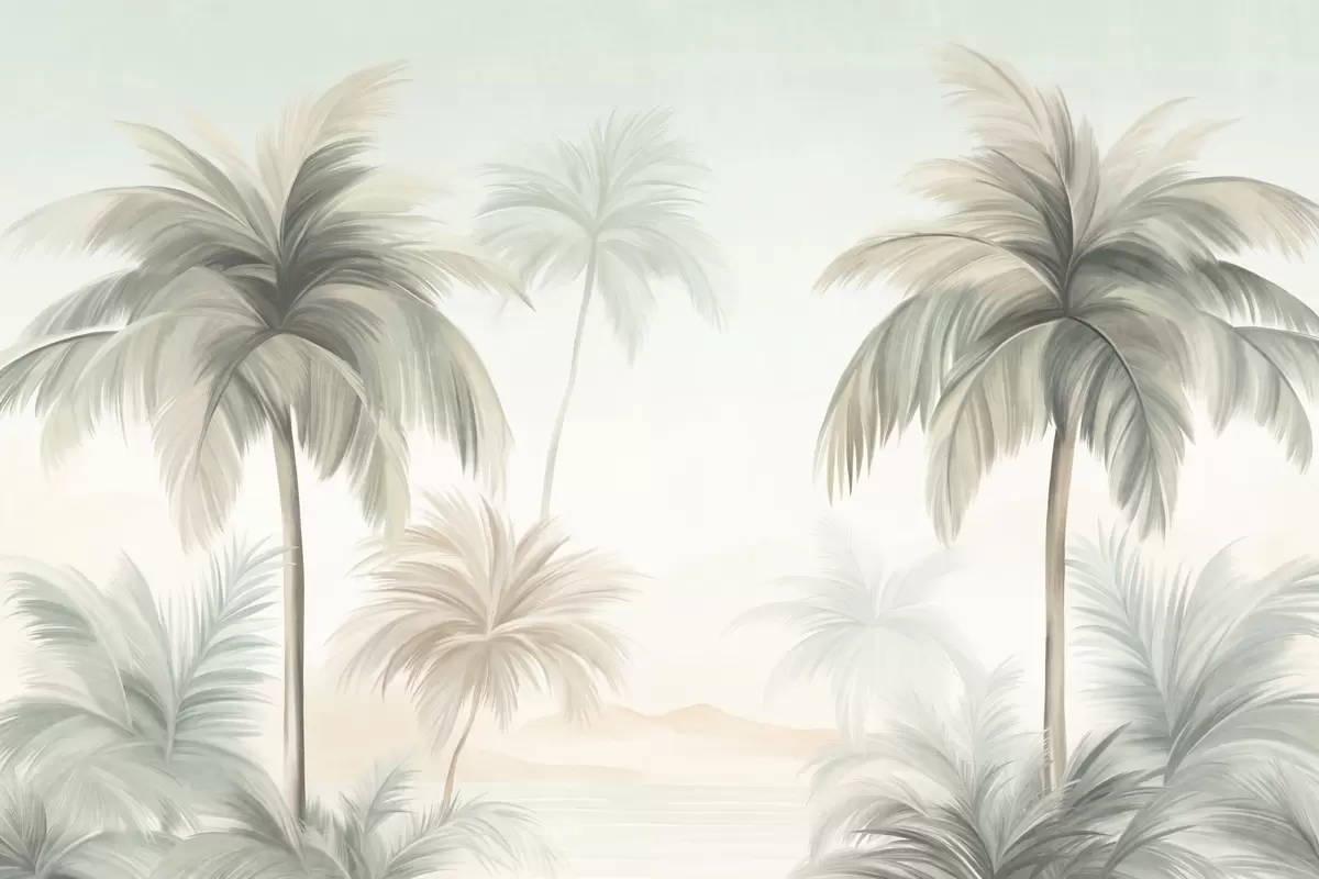 Carta da parati Alberi dalle foglie palmate, con fronde dai toni tenui di verde e beige, sullo sfondo di un cielo chiaro nr. w09770