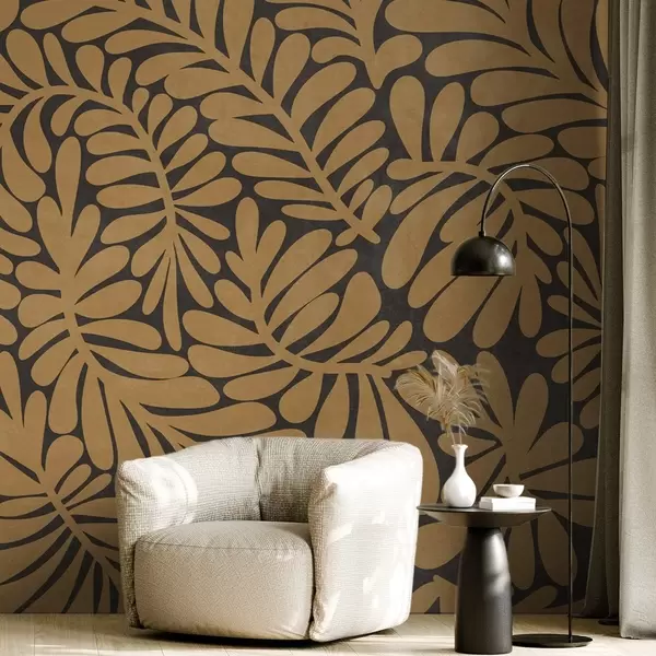 Carta da parati Foglie giallo senape stilizzate su uno sfondo grigio scuro, opera d'arte con texture nr. w09775