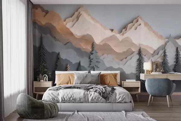 Carta da parati Paesaggio naturale con pini e montagne in stile intaglio del legno nr. w09793