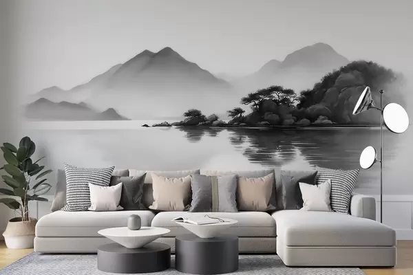 Carta da parati Paesaggio in bianco e nero con montagne e un lago avvolti da una leggera nebbia nr. w09803