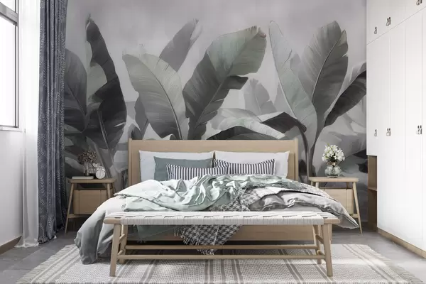 Carta da parati Foglie di banano tropicali stilizzate in una palette neutra con tenui tonalità grigio-verdi nr. w09805