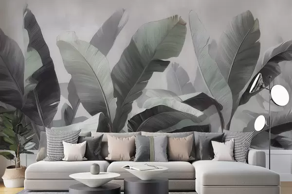 Carta da parati Foglie di banano tropicali stilizzate in una palette neutra con tenui tonalità grigio-verdi nr. w09805
