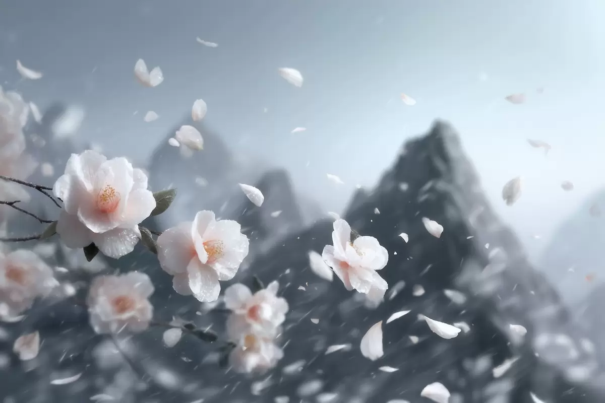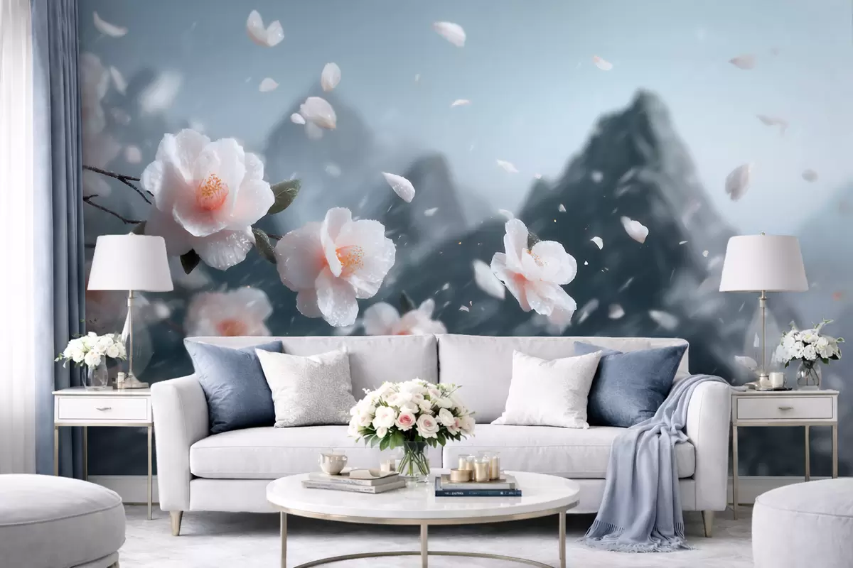Carta da parati Delicati fiori di ciliegio su uno sfondo montuoso: un suggestivo paesaggio giapponese dai toni pastello nr. w09808